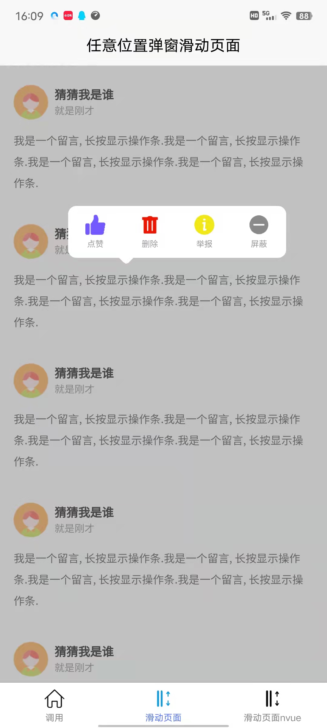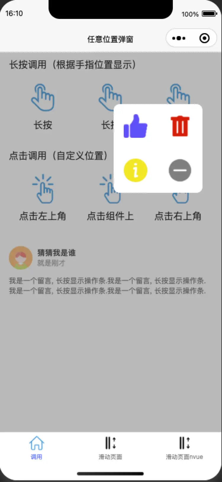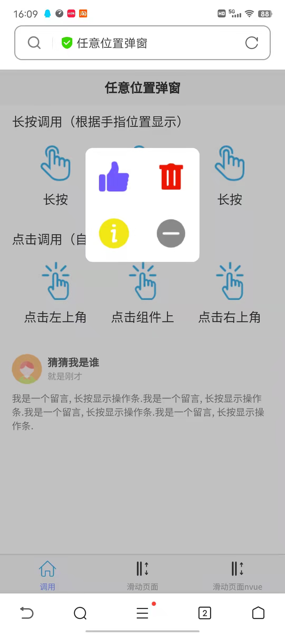 | adaption | Boolean | true | 是否开启自适应, 一般在长按在手指位置弹出时开启,防止弹窗弹到屏幕以外,自行传入弹出位置的x,y值时最好关闭自适应 |