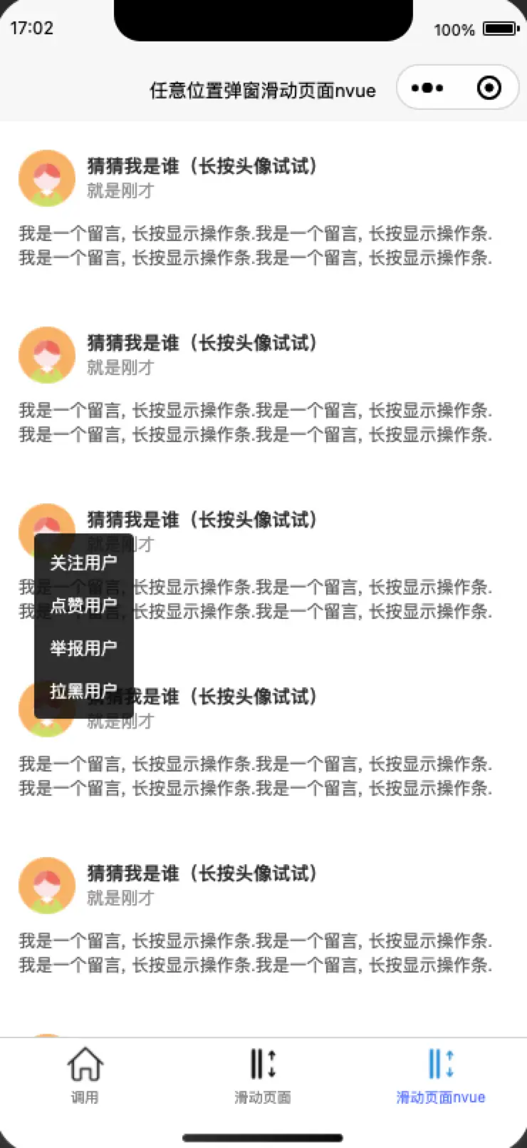 uni.getSystemInfoSync()中可获取windowTop。 - 长按时一定要传入是否有原生导航栏。