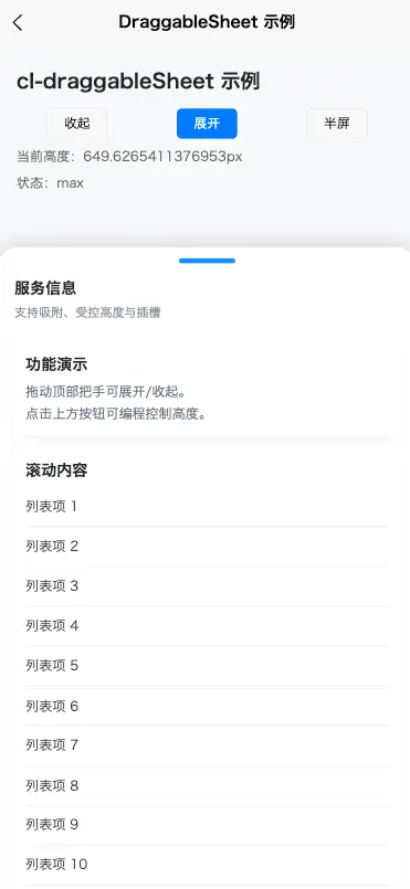 支持拖拽、吸附点、受控高度、插槽自定义、事件通知与滚动锁定。