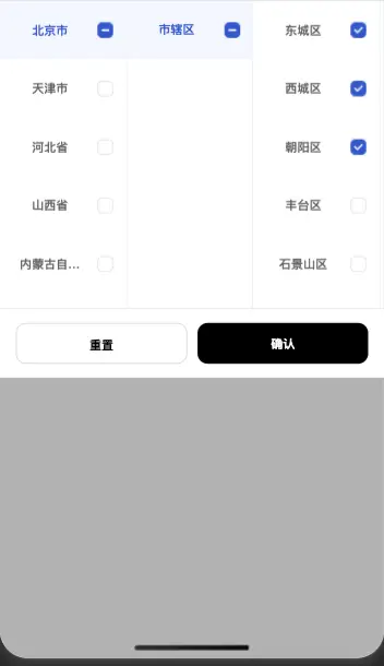 省市区多选三级联动选择组件,回调confirm方法中,返回选中的省市区数据