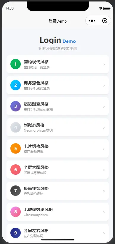 【多风格登录页合集】一套代码,五种场景:知识付费、商城、ERP、CRM、培训系统登录页,配色专业,适配微信/百度/钉钉/抖音小程序。即插即用,快速构建登录体验