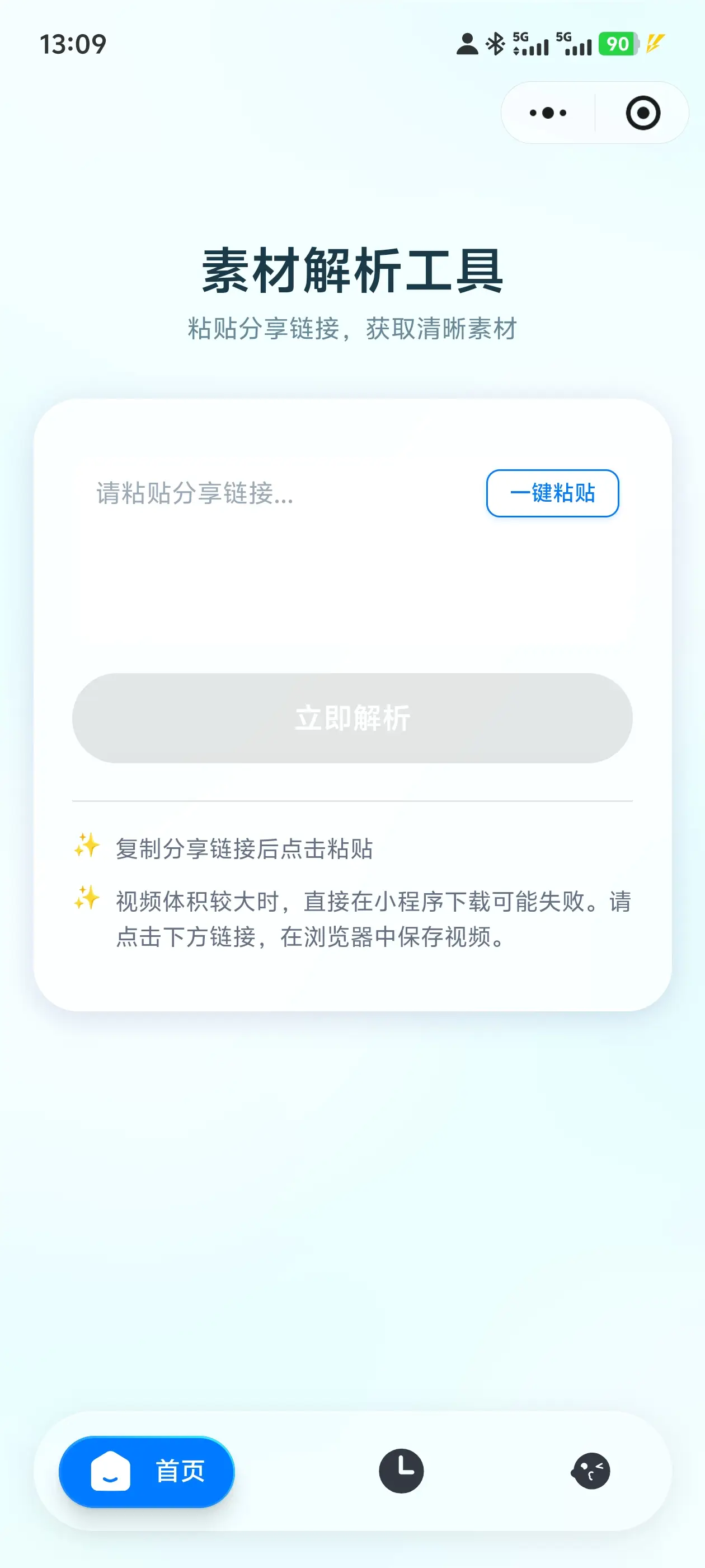 一款通用素材解析工具类微信小程序,用户可通过粘贴链接的方式解析视频 / 图片素材,获取原始清晰内容,用于个人学习与参考。