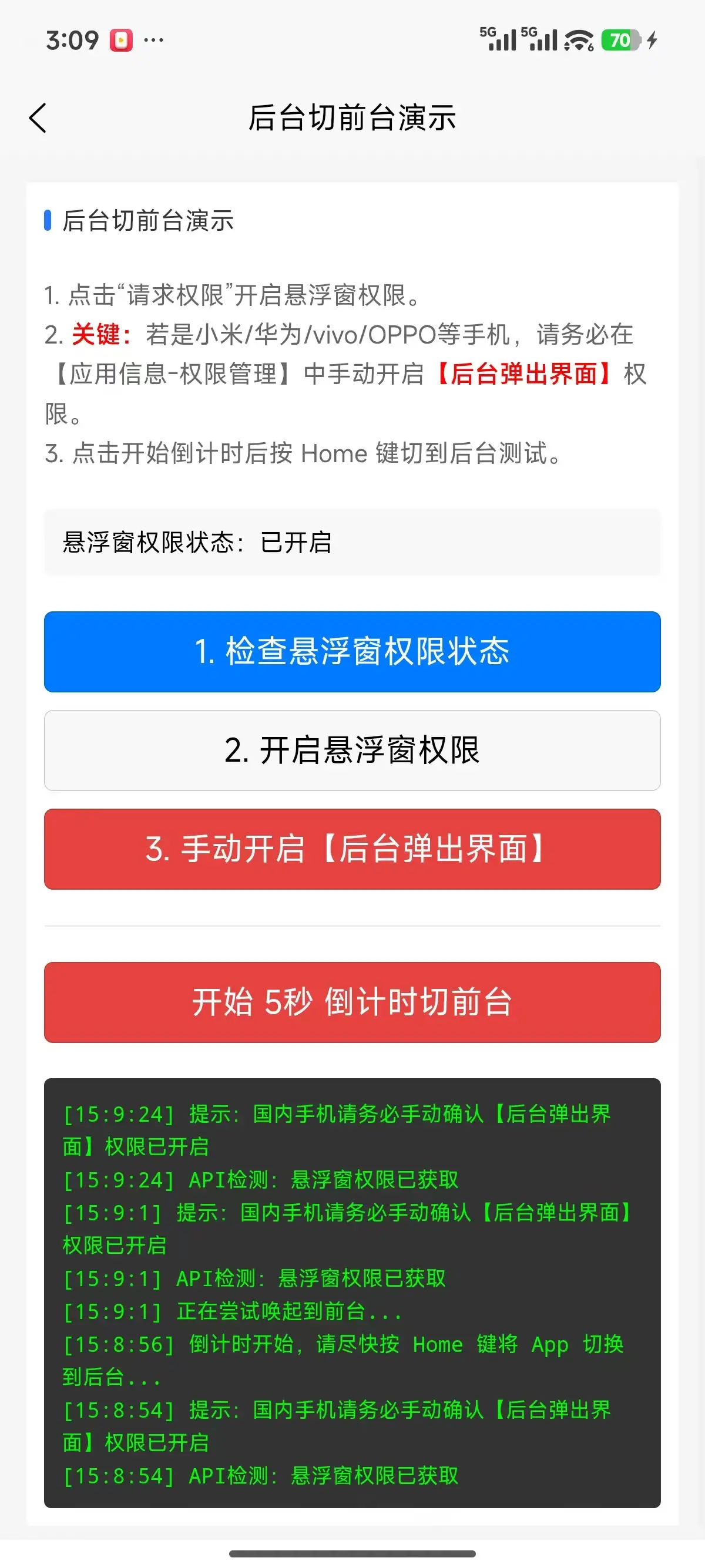 实现 App 后台运行过程中主动切换到前台显示,类似微信来电效果。