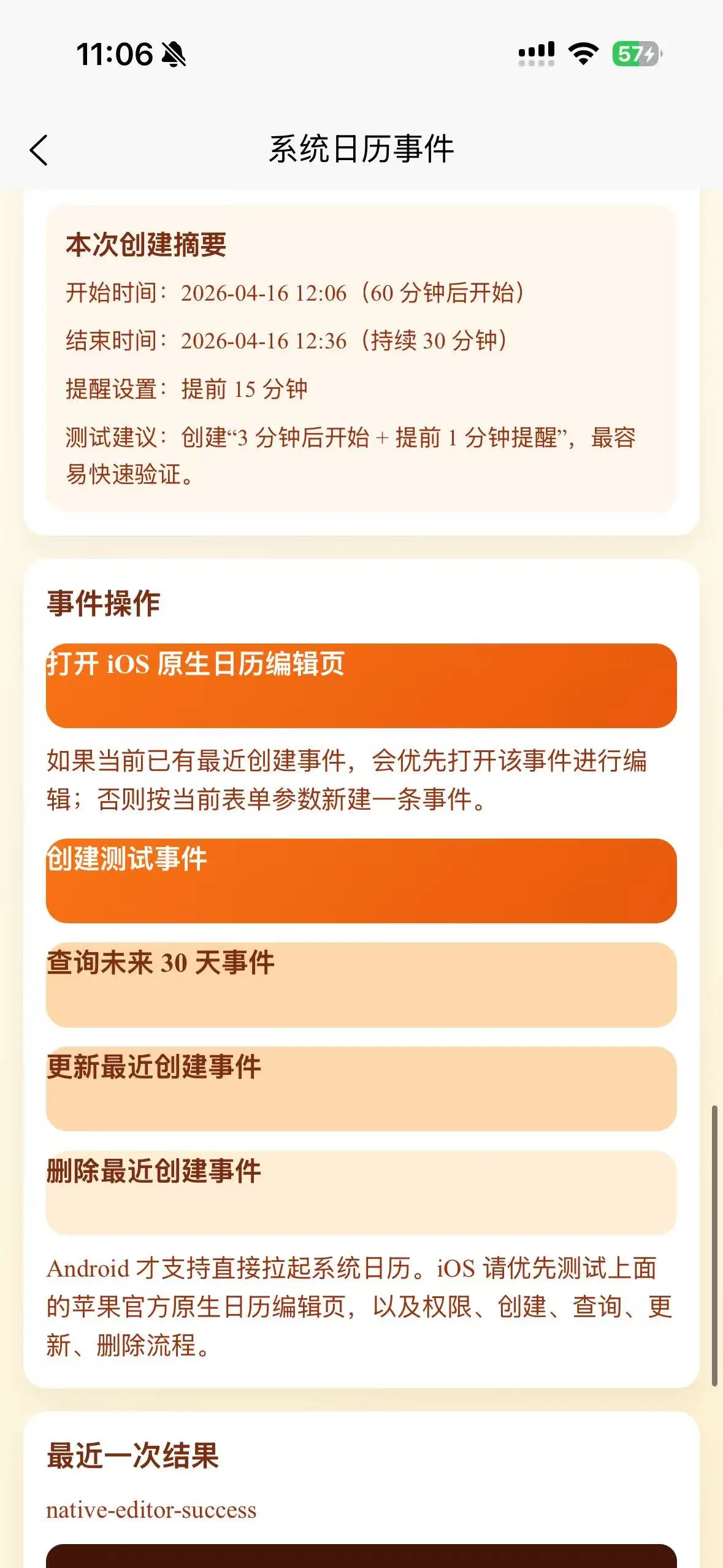 App 系统日历事件 UTS 插件,支持 Android/iOS,提供权限申请、事件创建查询更新删除、iOS 原生日历编辑页等能力。