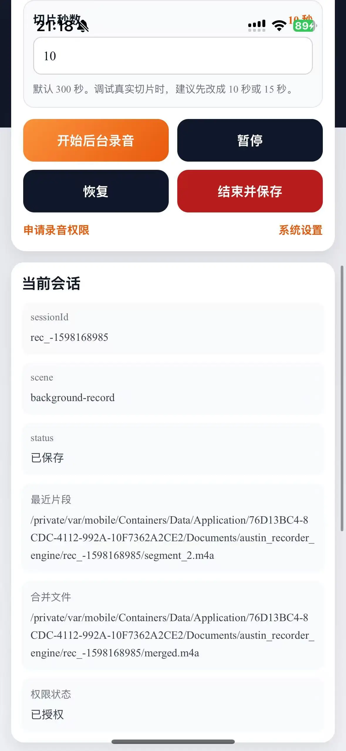 适用于行程录音、外勤取证、巡检采集等场景,支持Android/iOS录音、权限申请、暂停恢复、自动分片、合并输出和文件路径回调。