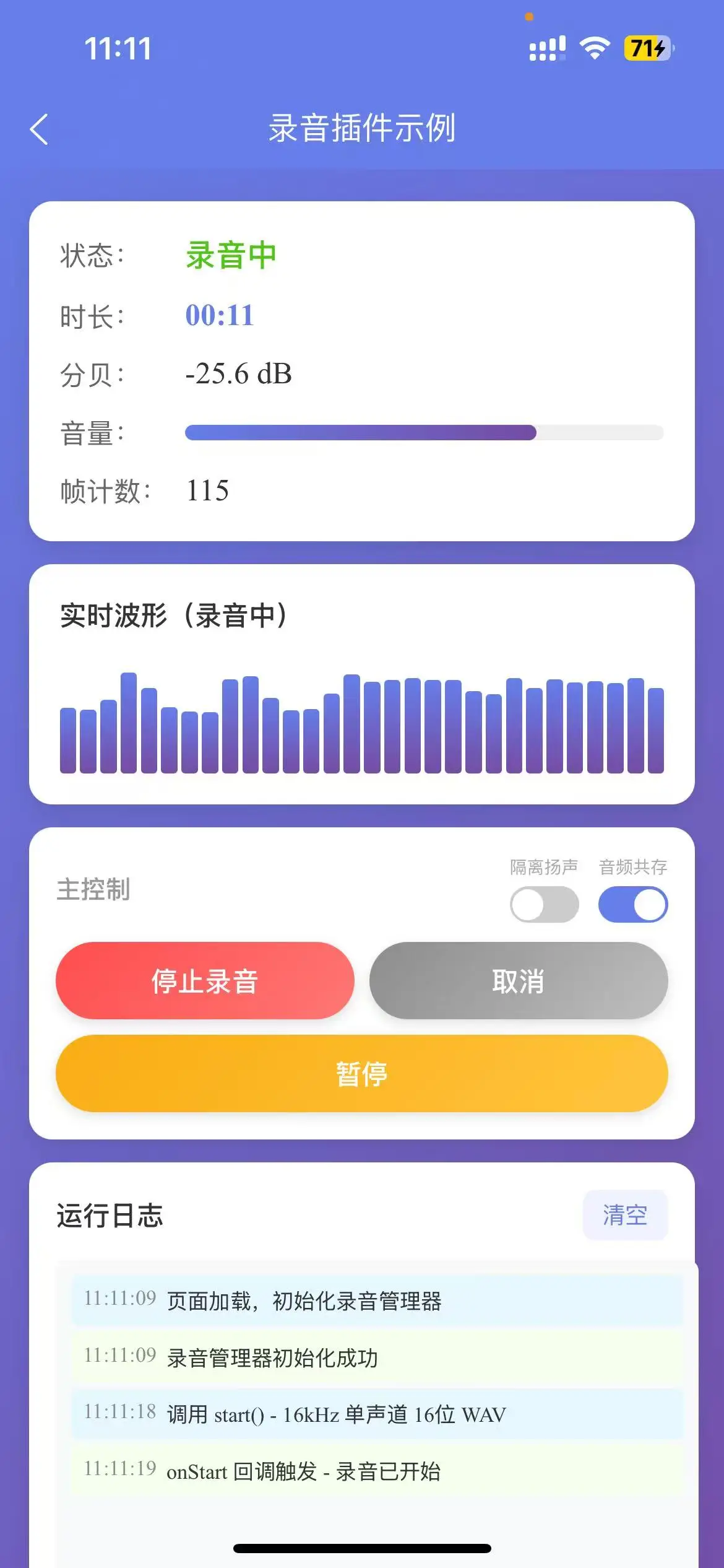 支持Android/iOS的录音插件,支持实时音频帧数据回调(onFrameRecorded)和分贝计算,参考微信getRecorderManager API设计。支持实时语音识别、波形显示等场景。