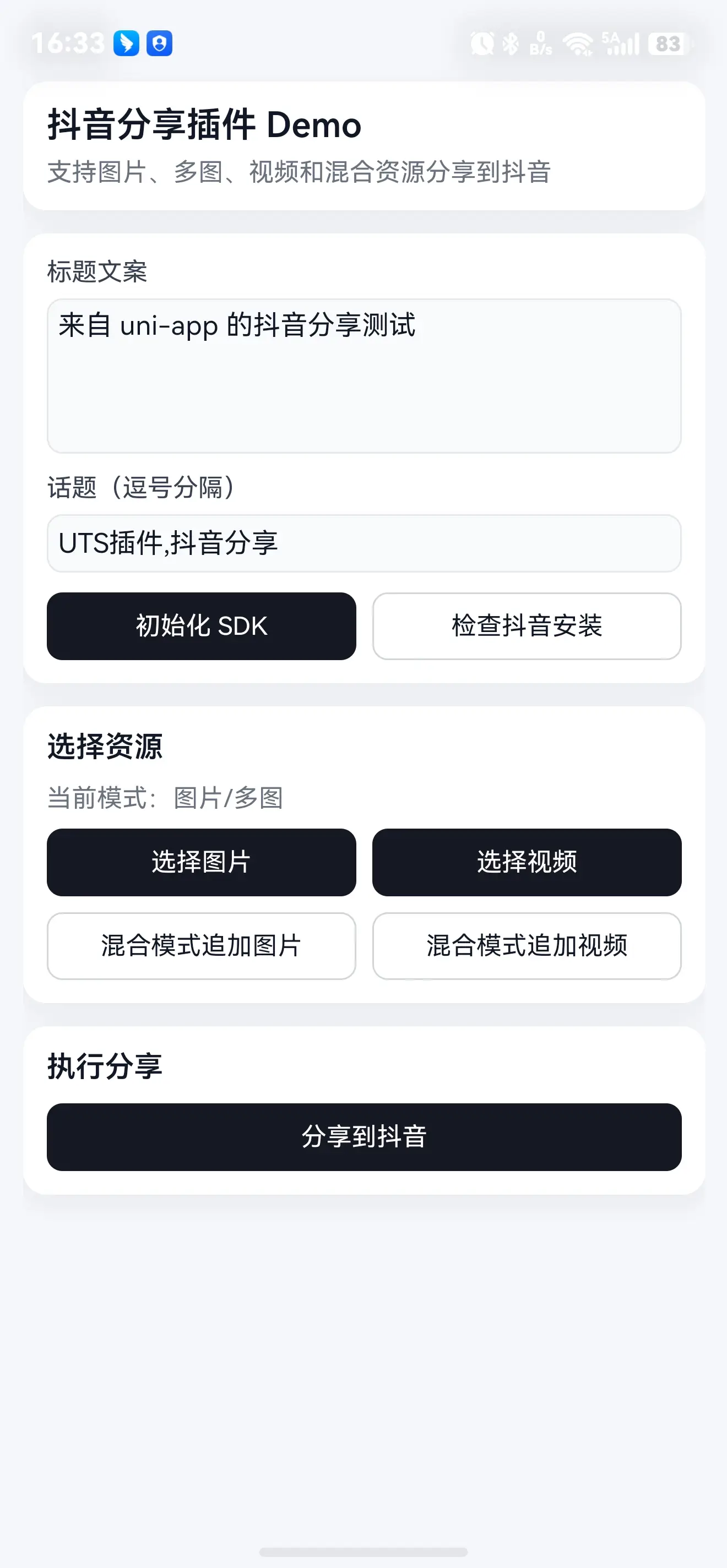 抖音开放平台分享 UTS 插件,支持图片、多图和视频分享到抖音