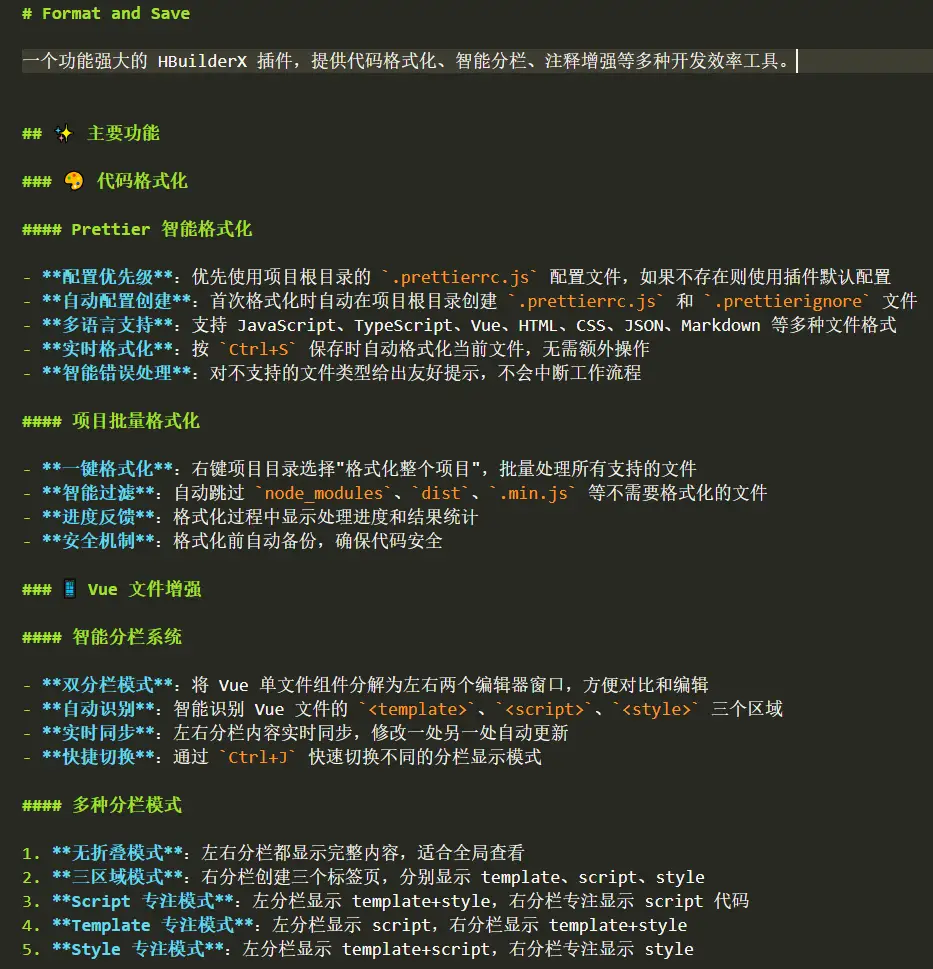 1.prettier格式化(基于根目录配置文件),2.整个项目格式化(项目目录右键整体格式化)3.vue文件双分栏模式且自动折叠,4.html和css中嵌套注释,5.使用vscode打开所在目录,6.快速选中双引号区域,7.生成块注释`/** */`