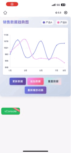 高性能折线图,兼容微信、支付宝、抖音小程序,其他未测试;内置入场动画和数据更新过渡动画;自动计算Y轴范围,自动适配屏幕尺寸