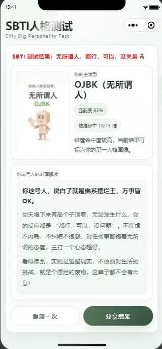 一款基于 uni-app 开发的 SBTI 人格测试小程序源码,包含标准版与扩展版双题库、随机出题、结果页展示、分享传播、激励广告解锁等完整功能,适合快速上线测试类产品