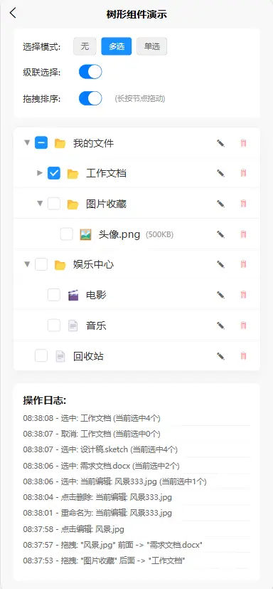 功能丰富的 Vue 2 树形组件,专为 Uni-app 开发。它支持自定义节点、图标、拖拽排序(长按)、节点编辑/删除、复选框/单选框选择等功能。