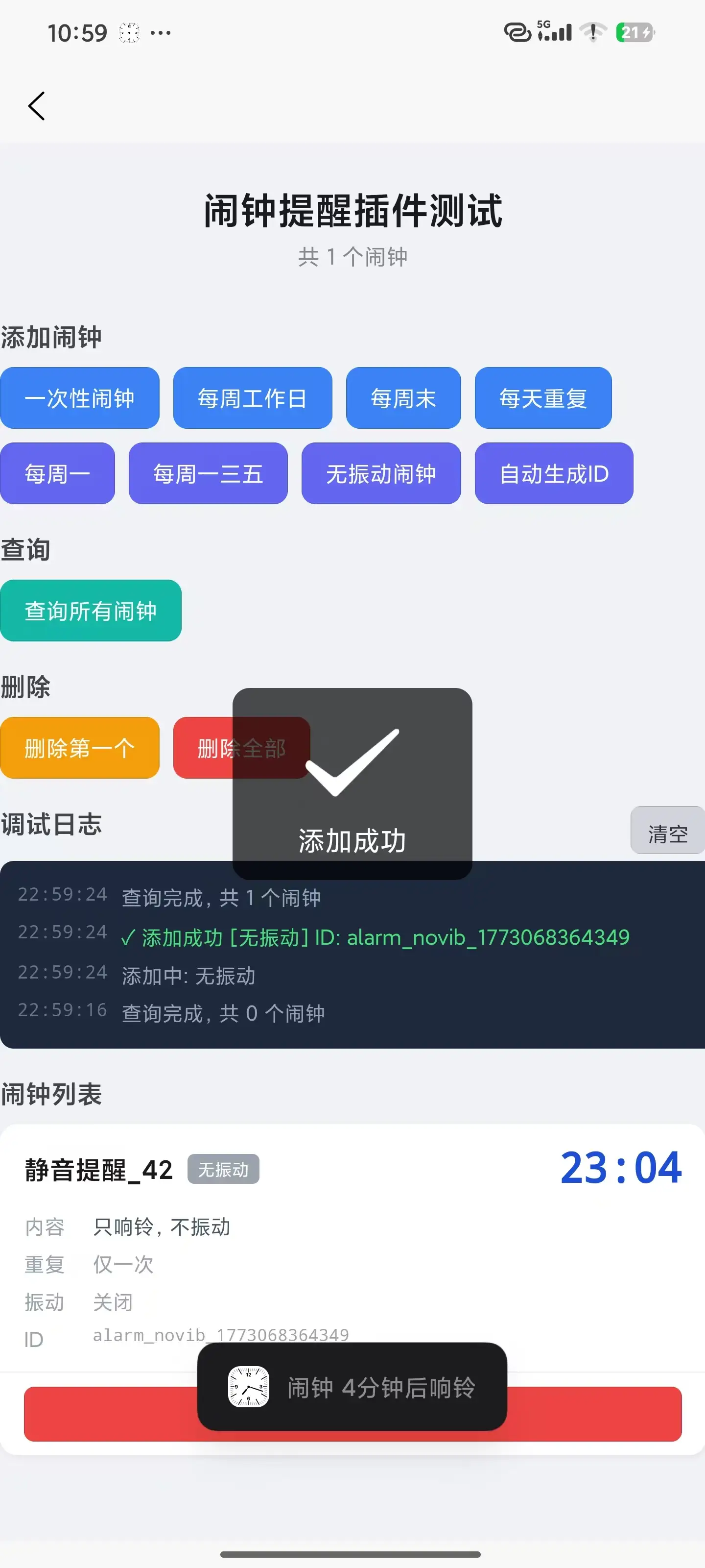 跨端闹钟提醒 UTS API 插件,支持 Android(系统闹钟)和 iOS(本地通知),提供添加、删除、查询闹钟功能。