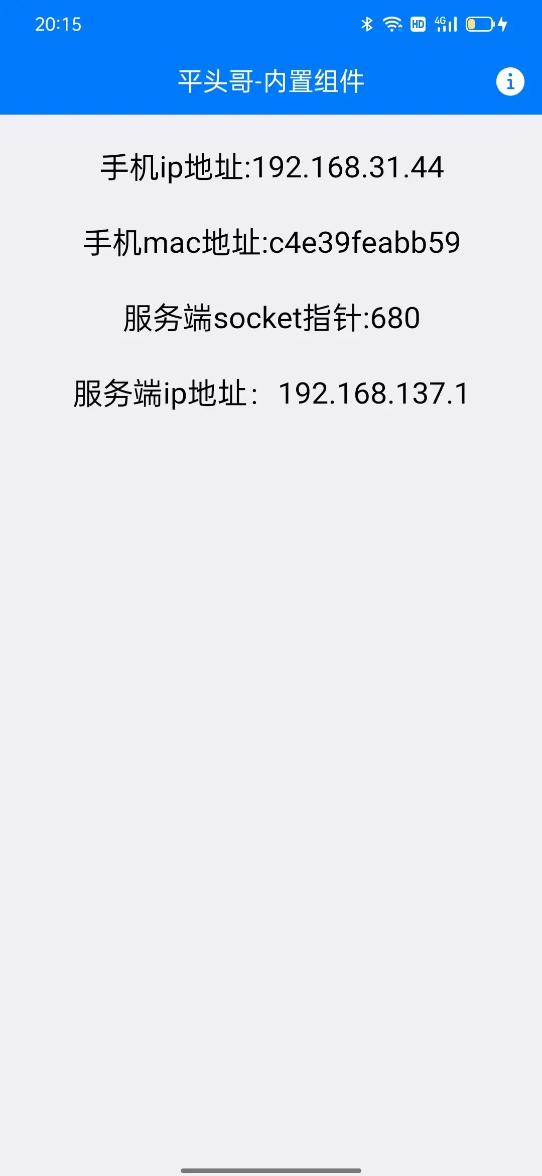 2022-11-19 v0.1版本 --修订 功能概要: 获取手机地址:android适用,ios不适用。 暂定后补 获取手机mac地址:android适用,ios不适用。暂定后补。 c++建立socket服务端:android适用,ios适用。 c++服务端ip地址获取:android适用,ios适用。