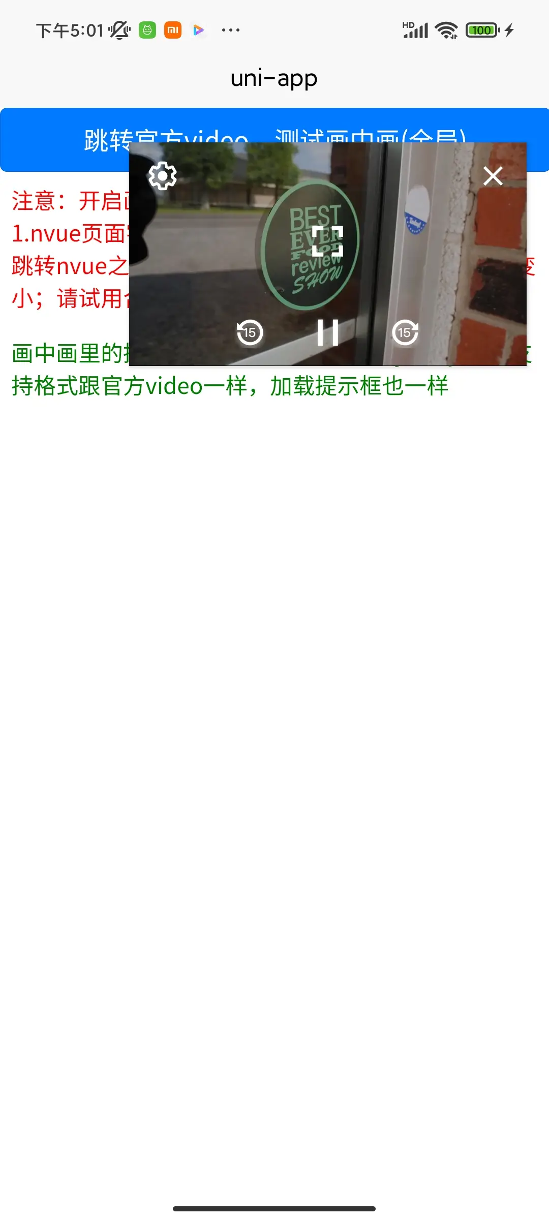 <view class="text">注意:开启画中画之后,目前已知会出现的问题:1.nvue页面字体会变小,vue页面没有问题,可以在跳转nvue之前关闭画中画;2.相关提示toast等等会变小;请试用合适再购买