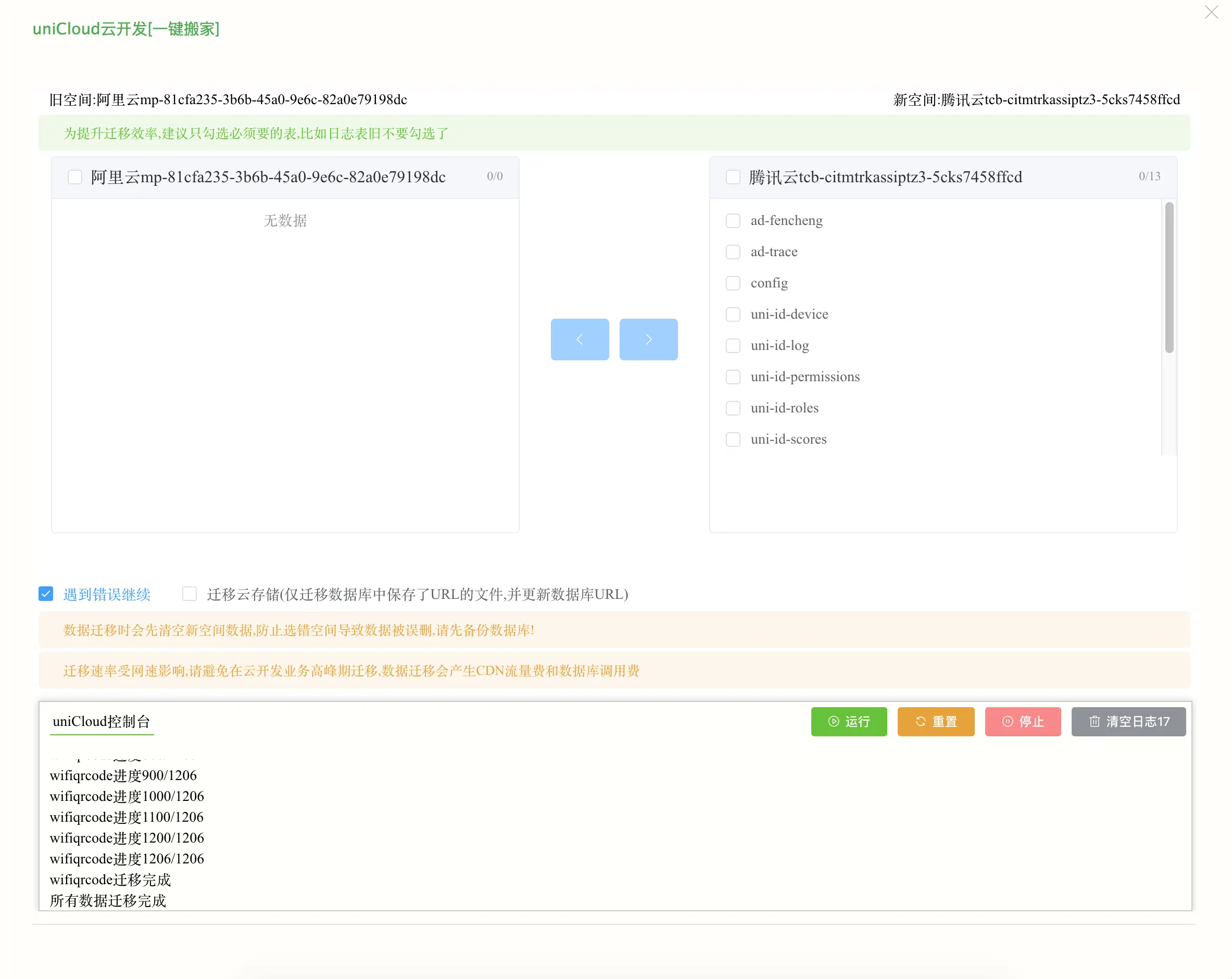 3、去掉勾选自动清空新空间数据表(不推荐),可用于多个空间迁移到同一个空间的情况,可能出现ID冲突,自己权衡利弊,后果自负。