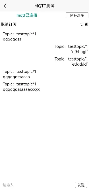 该函数回调结果示例如下 {"code":0,"msg":"mqtt连接成功"} {"code":3,"msg":"主题订阅成功:testtopic\/1","data":{"topic":"testtopic\/1"}} {"code":2,"msg":"MQTT 收到消息!","data":{"topic":"testtopic\/1","message":"qqqqqqss"}} {"code":1,"msg":"MQTT 发送消息成功\/完成","data":{"topic":"testtopic\/1","message":"\"ttuuuy\""}} -