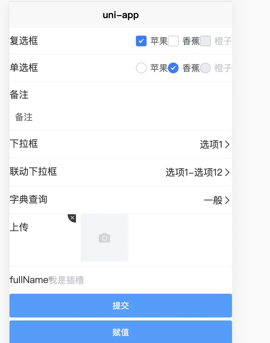 | type | 表单类型 | String | slot-插槽 input-输入框 select-下拉框 textarea-文本域 radio-单选 checkbox-多选 upload-上传 dict-字典查询 date-日期 |