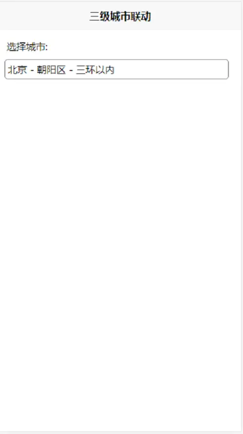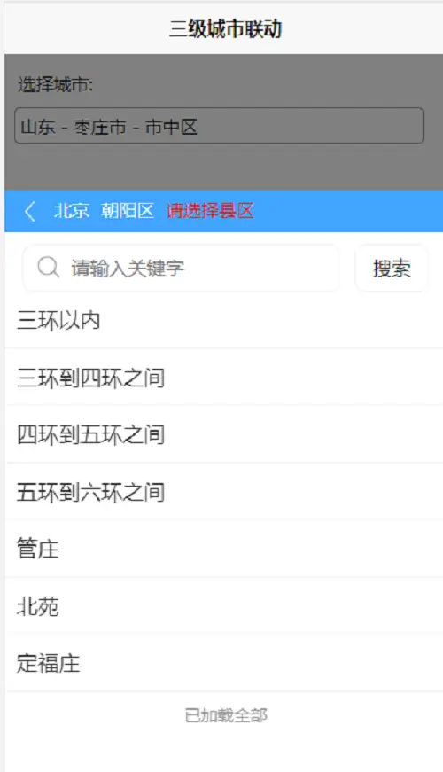 - 使用 在需要使用组件的页面引入cityChiden.vue,选择完后会返回一个包含省份,城市,县区的对象,父组件接收selCity事件,接收数据