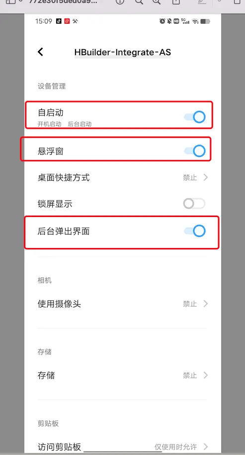 - 在app设置里面开启权限,需要开启"自启动"、"悬浮窗"、“后台弹出界面”、“锁屏显示”这些权限,见插件截图。