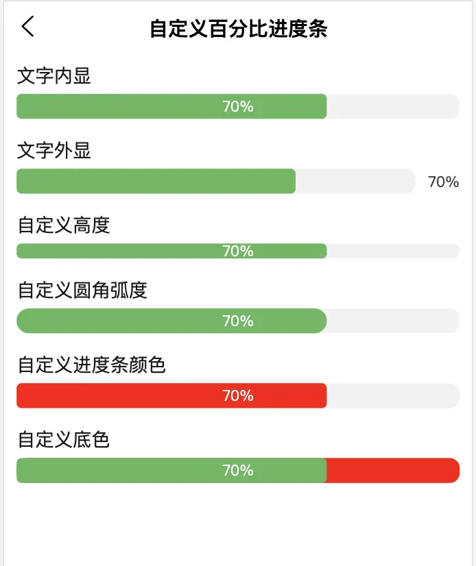 本组件支持自定义,支持设置文字内显、当前进度、文字颜色、文字大小、进度条颜色、进度条底色、进度条高度、进度条圆角弧度