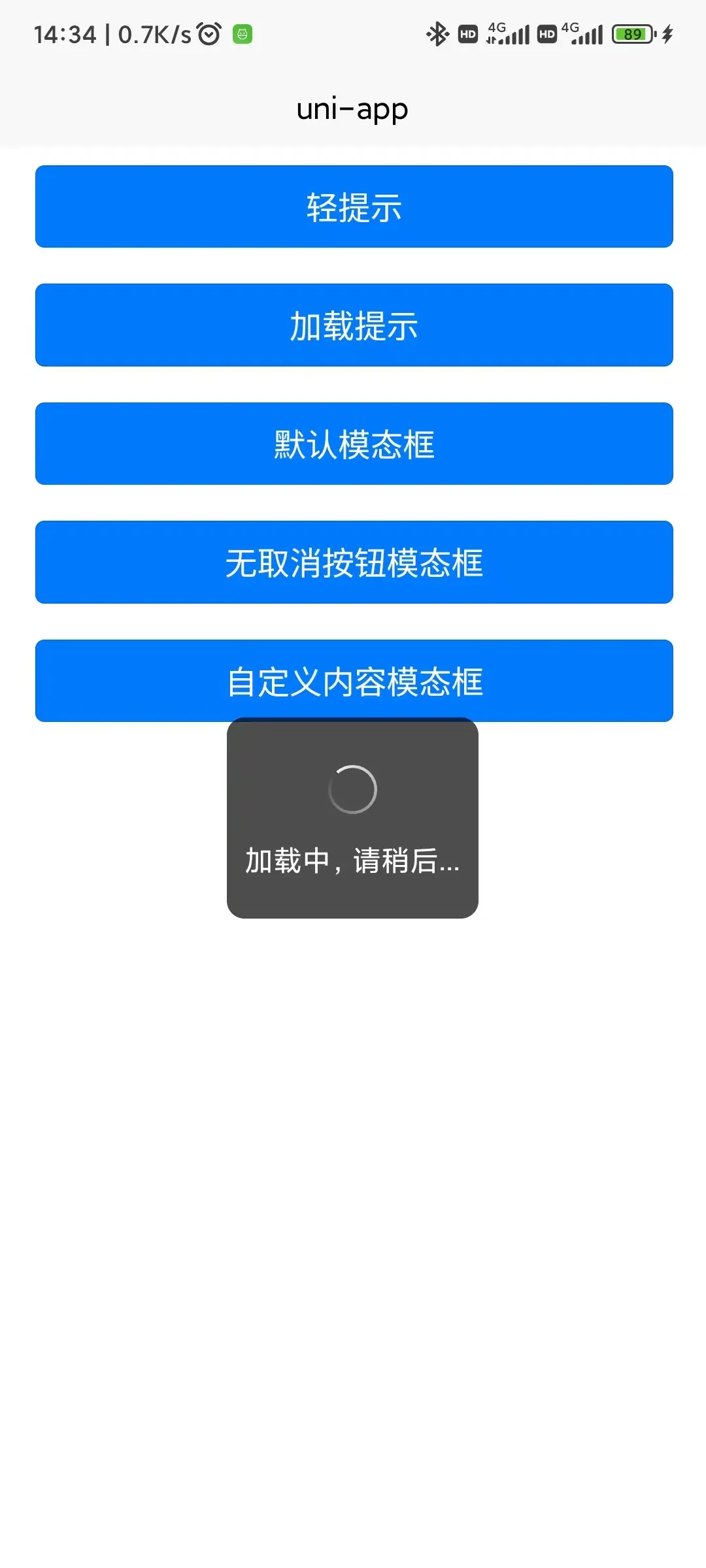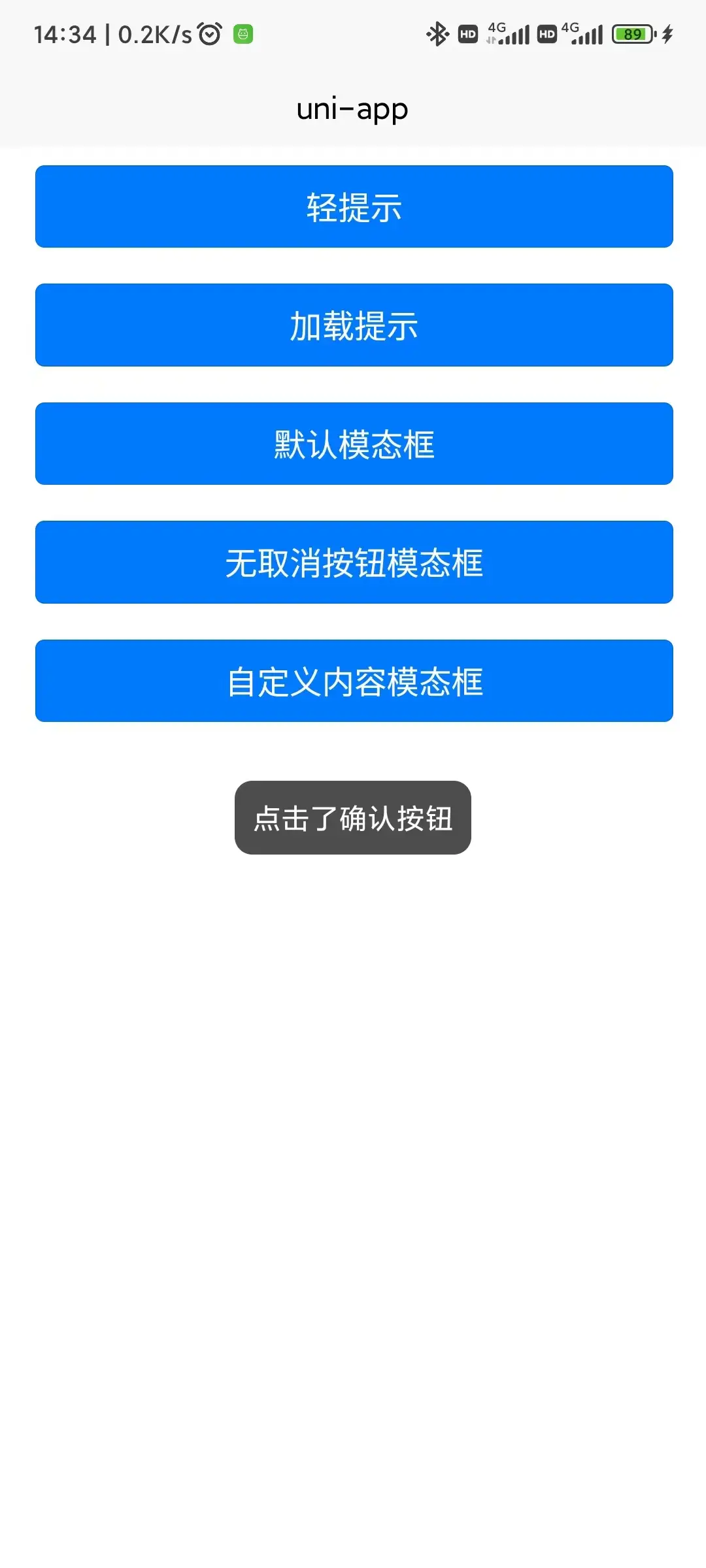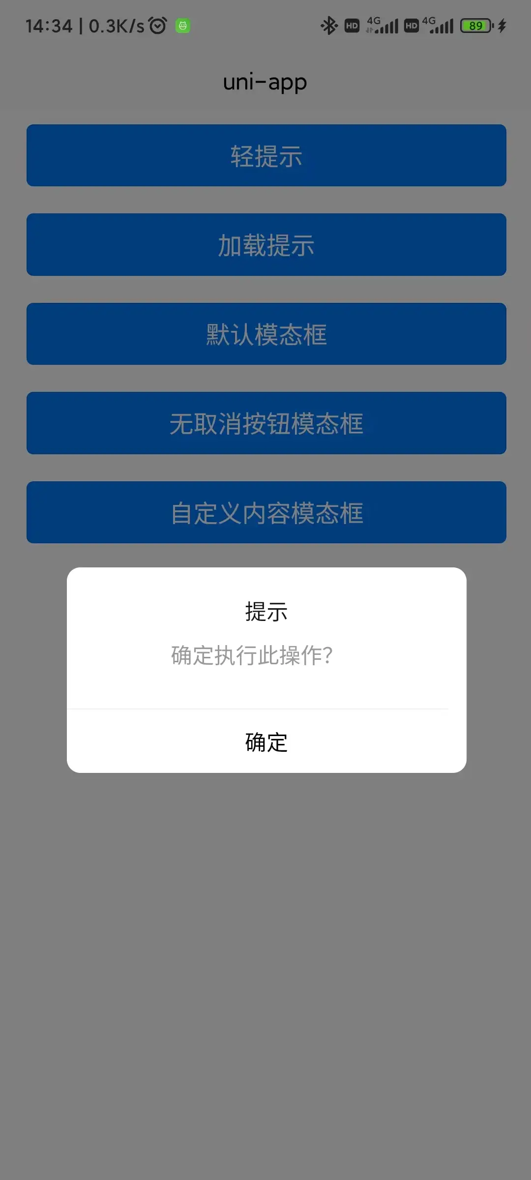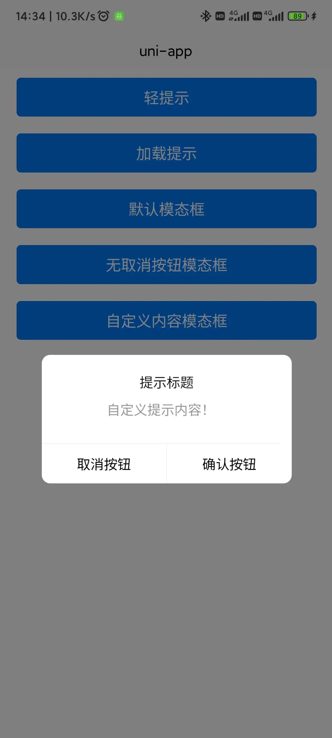 **注意:可下载示例项目跑起来看看就很清楚了,android 、H5 上亲自测试过的。确认提示框是基于纯vue 实现的,可根据自己的需求灵活修改样式,真正解决了uniapp 自带的uni.showModal()模态框 在app上无法修改样式的问题,**