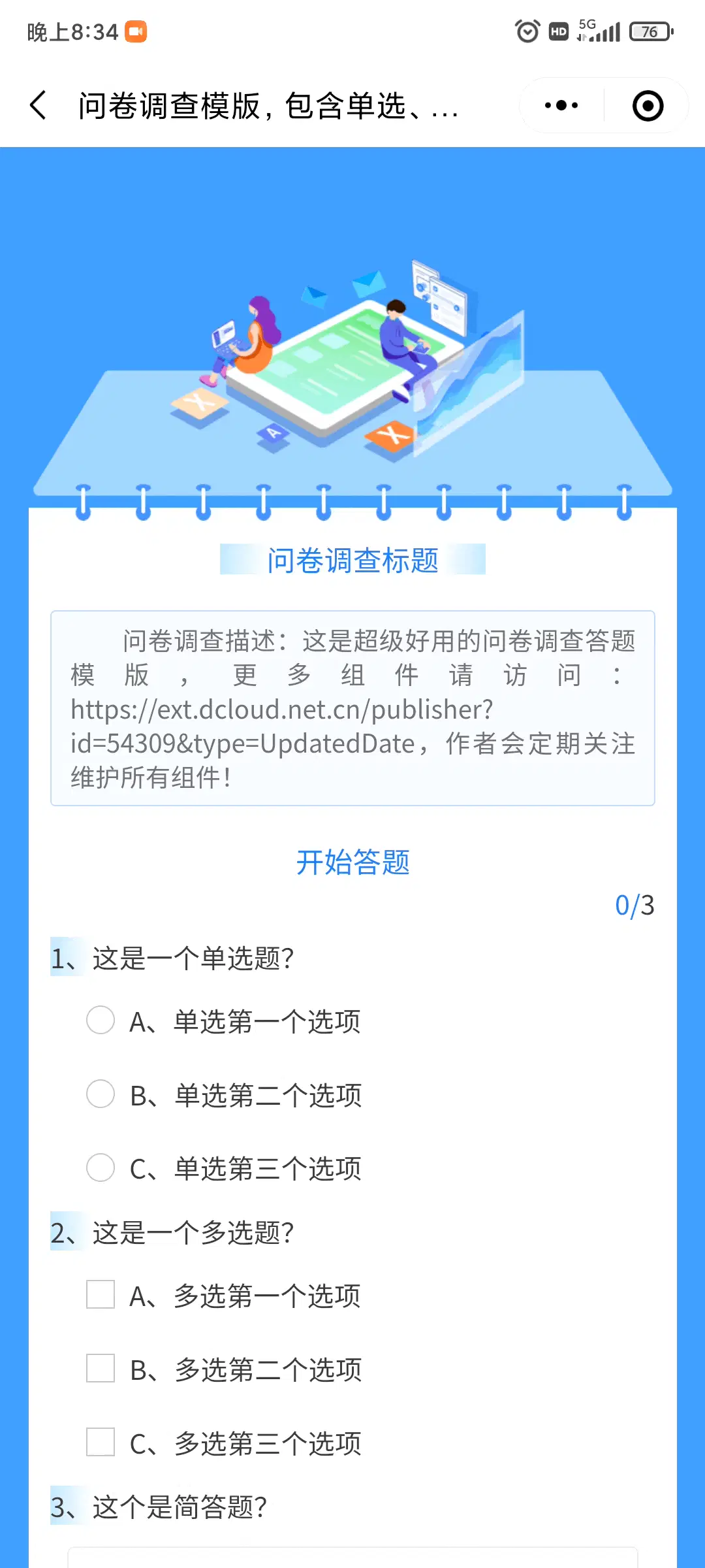 本组件是超级好用、超级好看的问卷调查模版,包含单选、多选、简答题,支持样式自定义,源码简单易修改