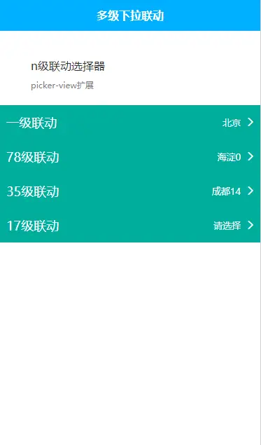 picker实现多级联动: 1.可以实现多级联动 2.每一级联动选择一项,后边的都要重新选择