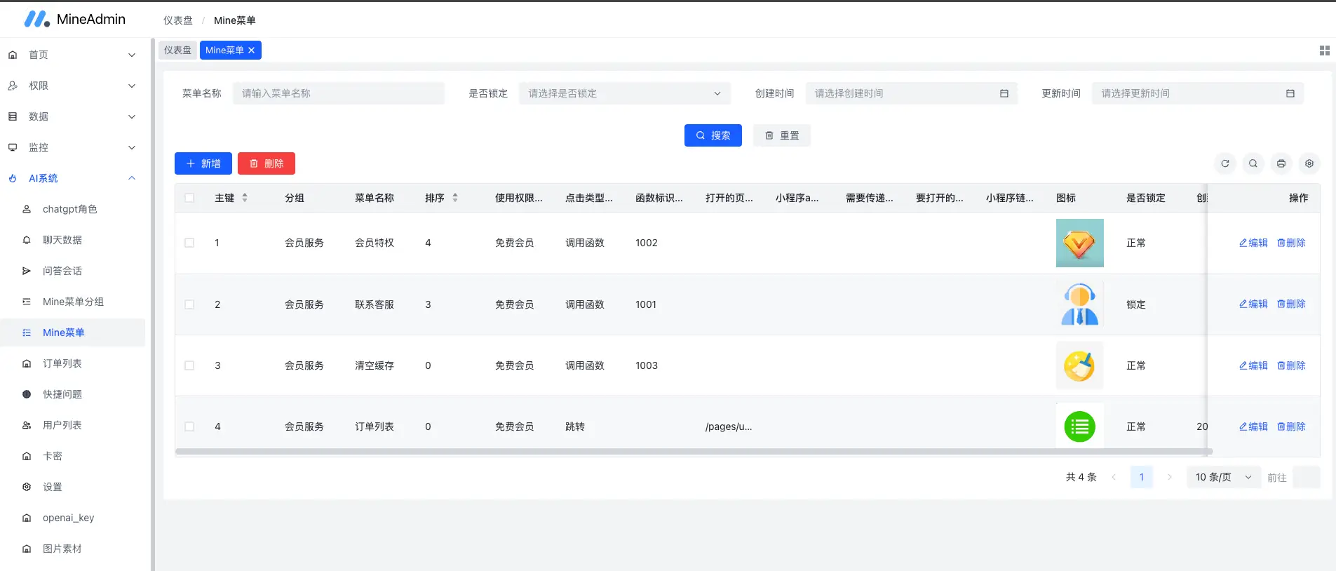 后台:chatgpt角色自定义、快捷提问管理、聊天数据管理、个人中心菜单管理、订单管理、用户管理、卡密管理、设置(openai地址、客服信息、用户协议等设置)、图片素材(个人中心banner)、openai_key管理(自动轮训)