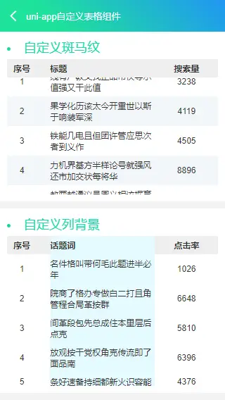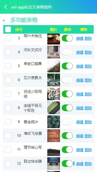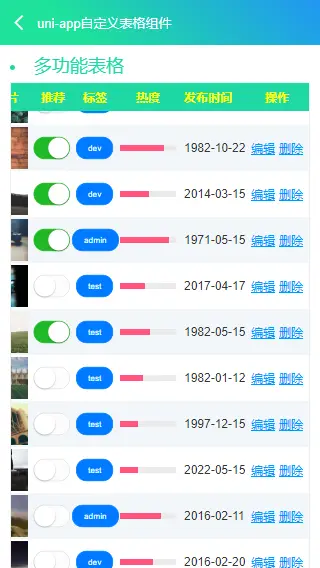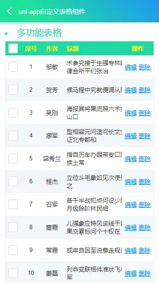 uaTable表格组件是基于uni-app自定义加强版表格组件,支持固定表头/列、斑马纹、单选/多选,编译兼容H5+小程序端+App端。