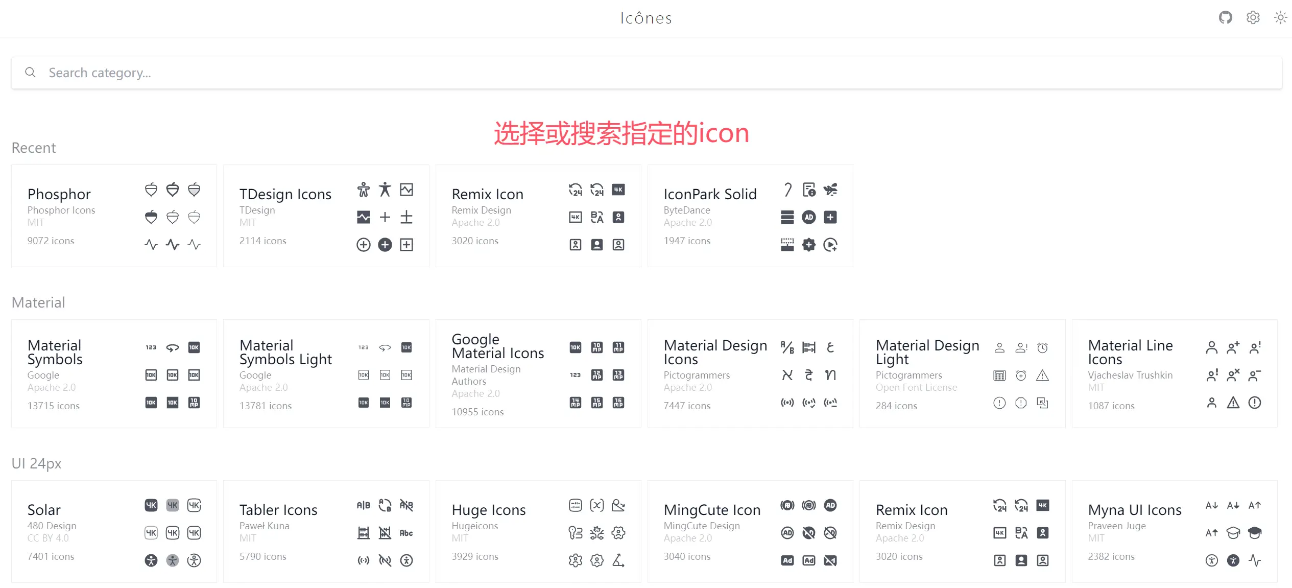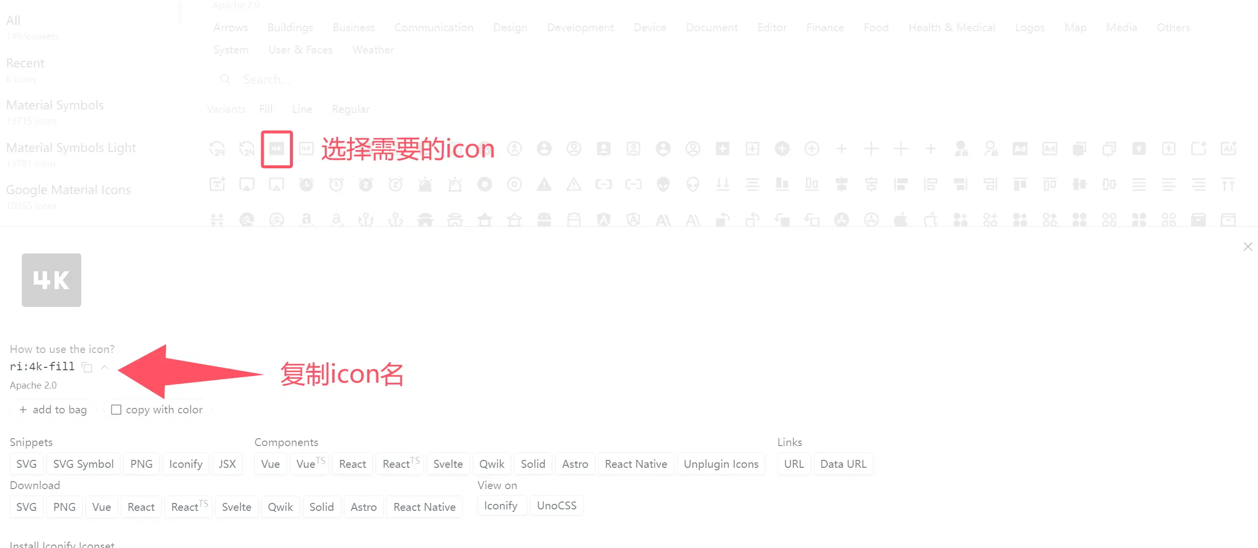 到 icones 网站找到需要的图标,通过 name 属性来指定需要使用的图标