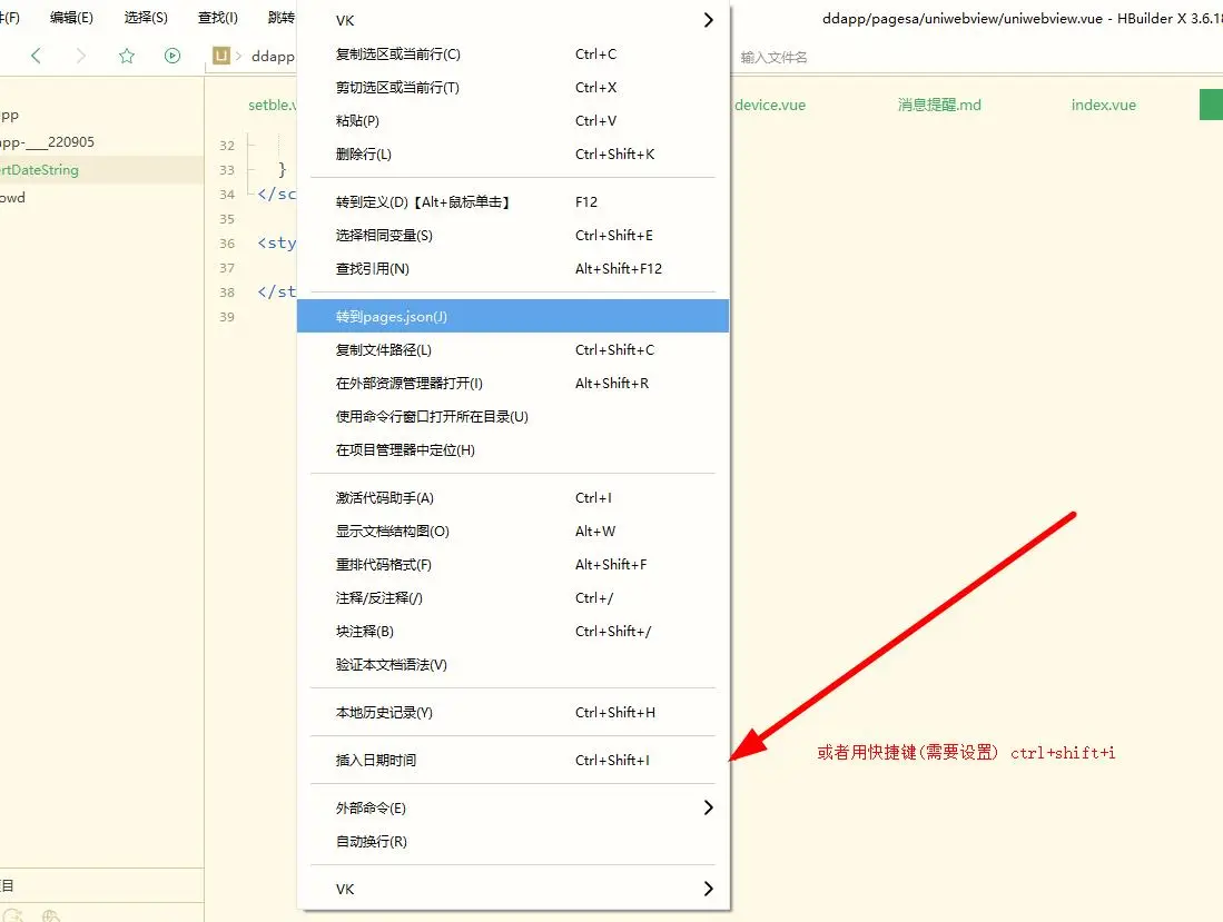 - 重启HBuilderX,随便打开个可以编辑的文件,点右键,就可以看到“插入日期时间”