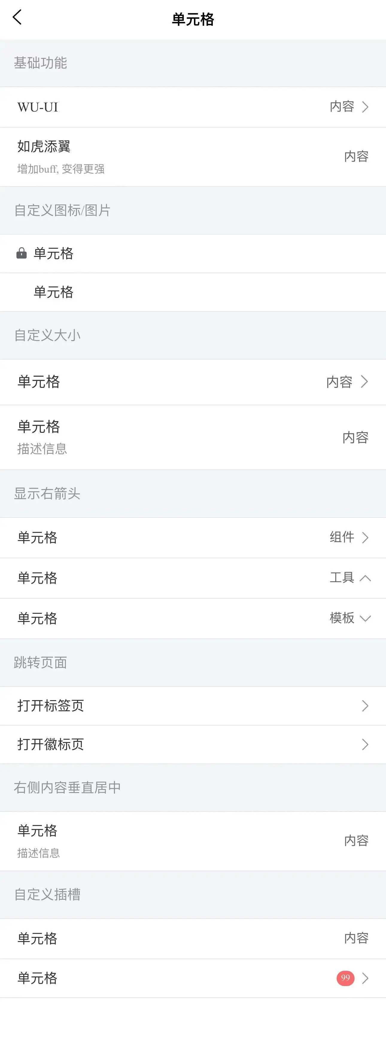 wu-cell 单元格一般用于一组列表的情况,比如个人中心页,设置页等。