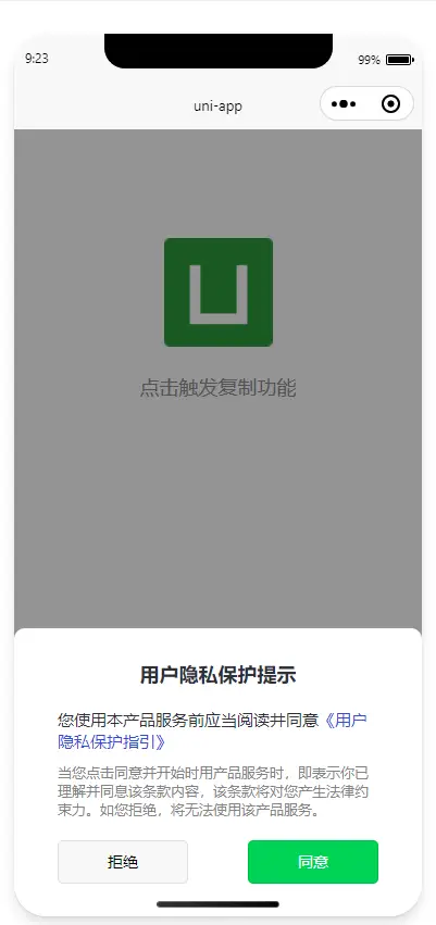 然后,经过查阅文档和社区,再加上不断踩坑,总结出来的uniapp一个解决方案。 注:目前uniapp官方更新了button组件和简单介绍了下微信小程序的新隐私政策,但隐私接口api依然是使用的微信小程序api。所以,还得是用原生的接口实现此需求。