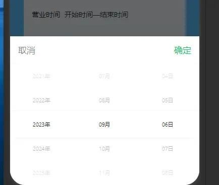 endDate: 表示有效日期范围的结束,字符串格式为"YYYY-MM-DD" startDate://表示有效日期范围的开始,字符串格式为"YYYY-MM-DD" getTime(e){ console.log('选择时间',e) }
