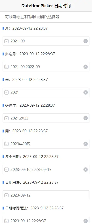 若只是需要单独选择日期和时间,不需要时间戳输入和输出,可使用原生的 picker 组件。 暂时没写文档,里面的东西还没归纳完整,具体下载示例查看用法