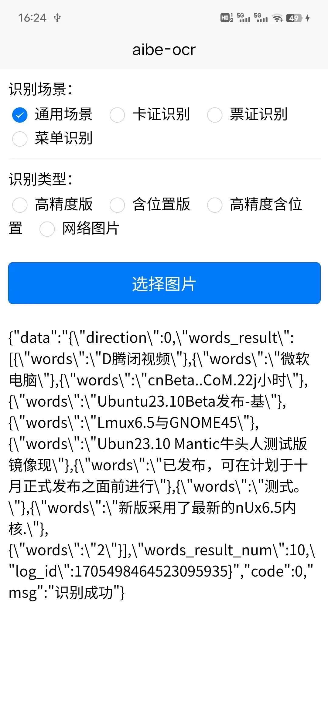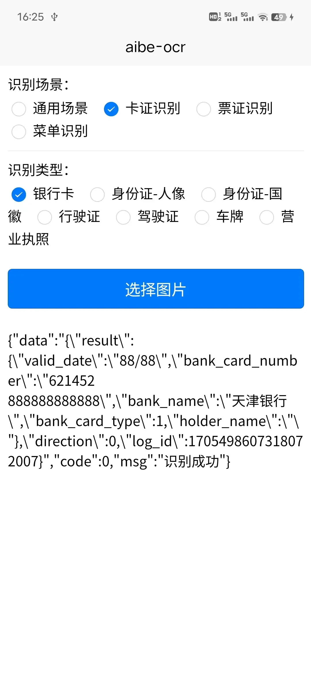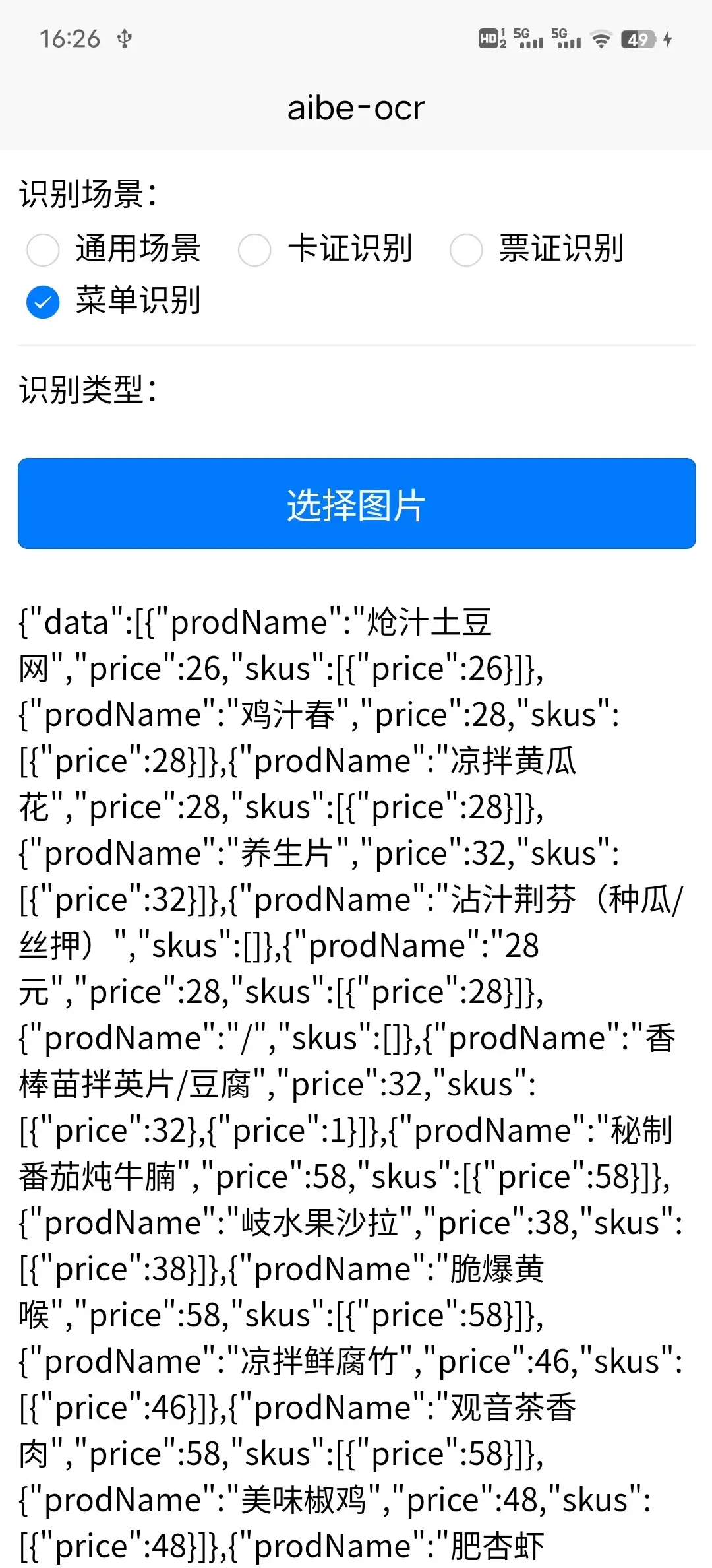 1、百度通用场景识别、网络图片识别、银行卡、身份证、行驶证、驾驶证、车牌、营业执照、菜单识别 2、仅支持Android,百度OCR Android SDK 2.0.1
