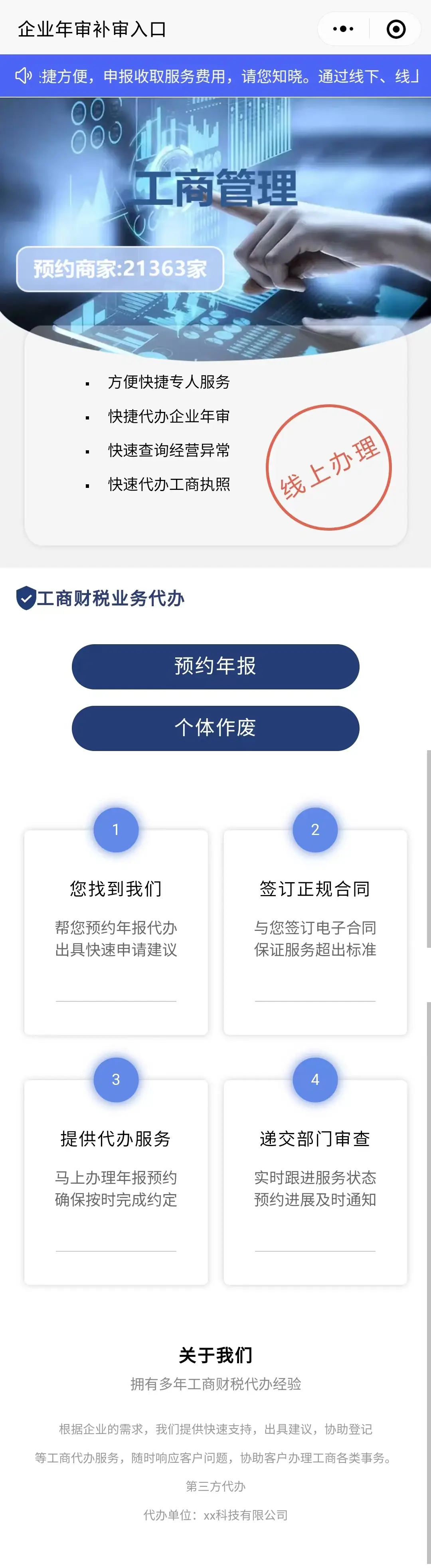 提供企业年审补审流程、创建订单、订单页等 5 张全流程页面模板;