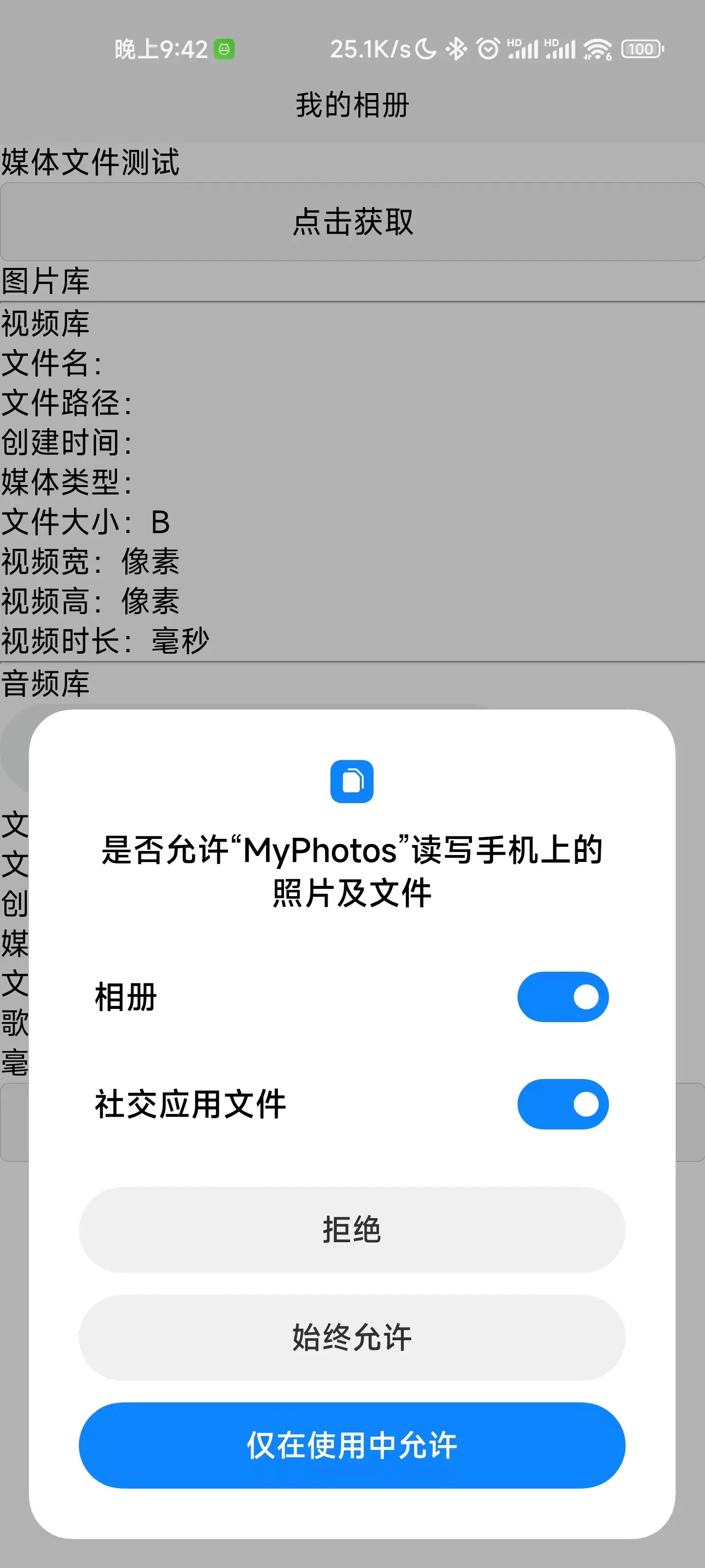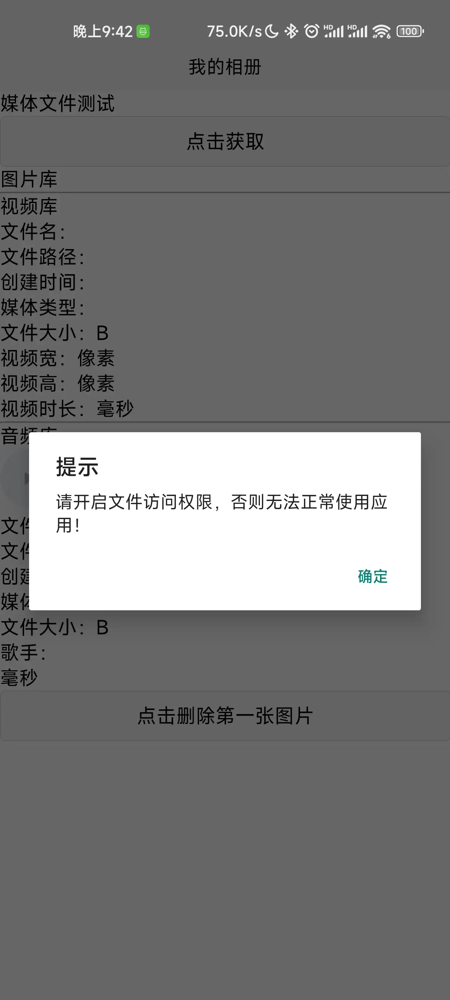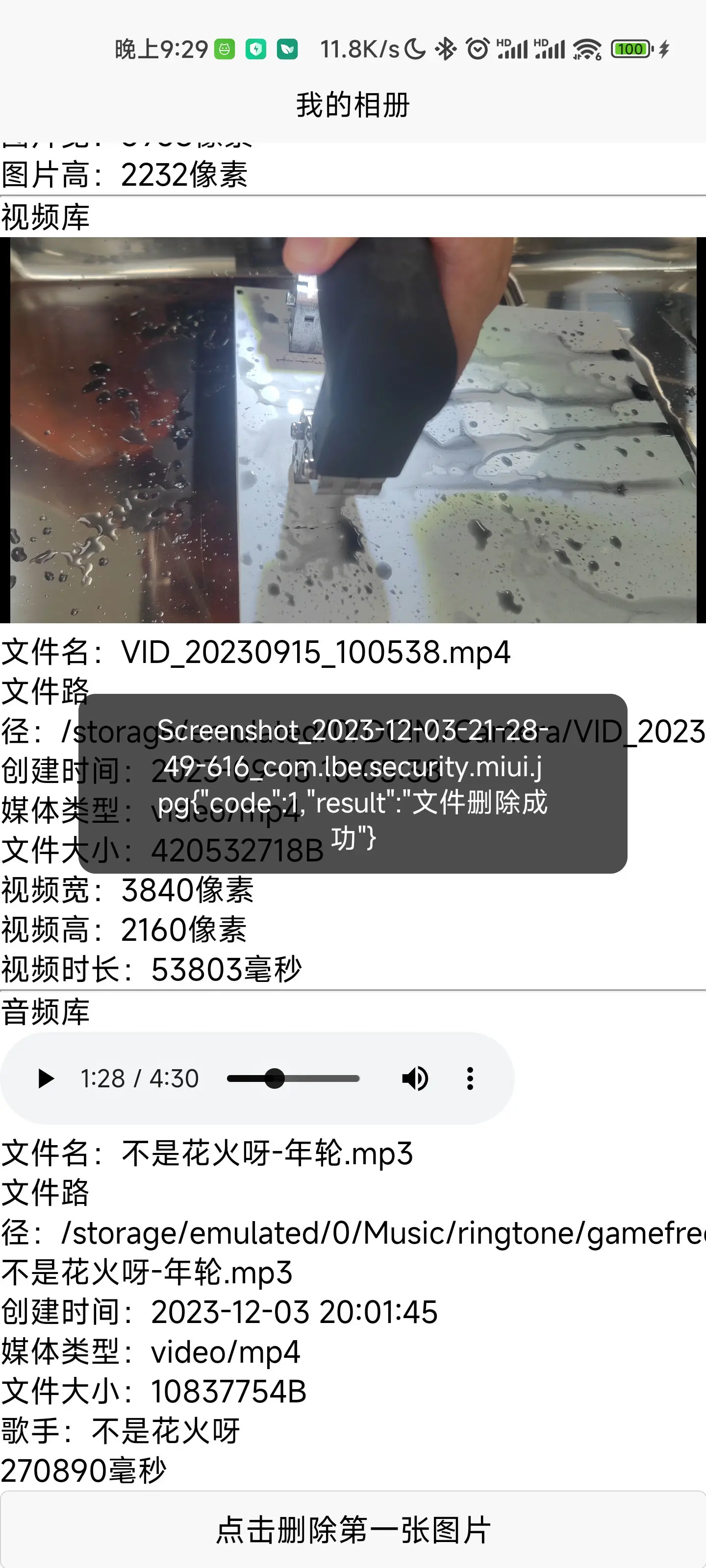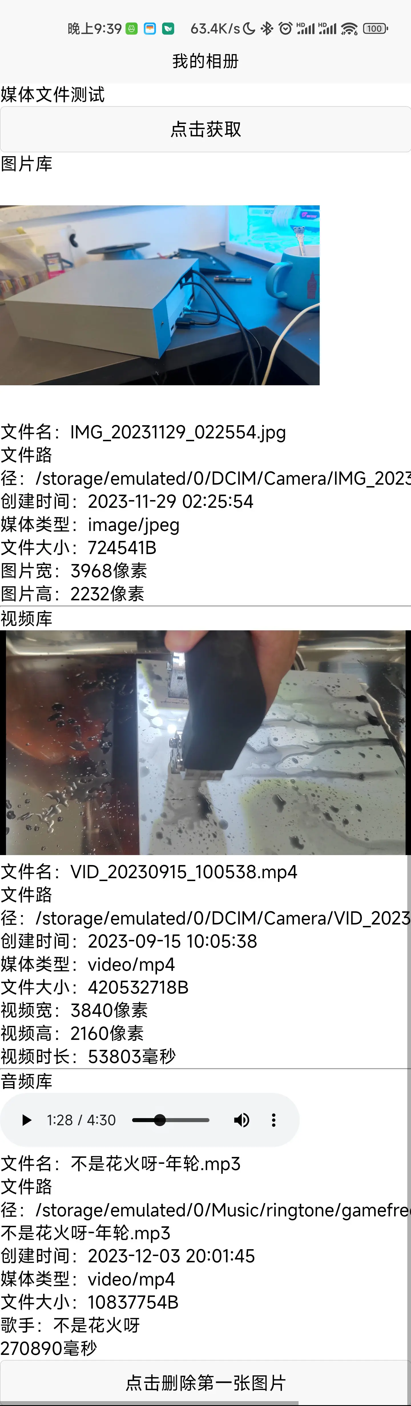 获取安卓媒体库(图片、视频、音频),获取路径、文件名、创建时间、媒体类型、文件大小、图片/视频宽高、视频/音频时长等,返回结果为文件信息列表,并以创建时间从新到旧排序。具有删除功能。自动获取权限. 原生动态获取读写权限。 getImageList() 获取所有图片 getAudioList() 获取所有音频 getVideoList() 获取所有视频 delFile() 传入绝对路径删除文件
