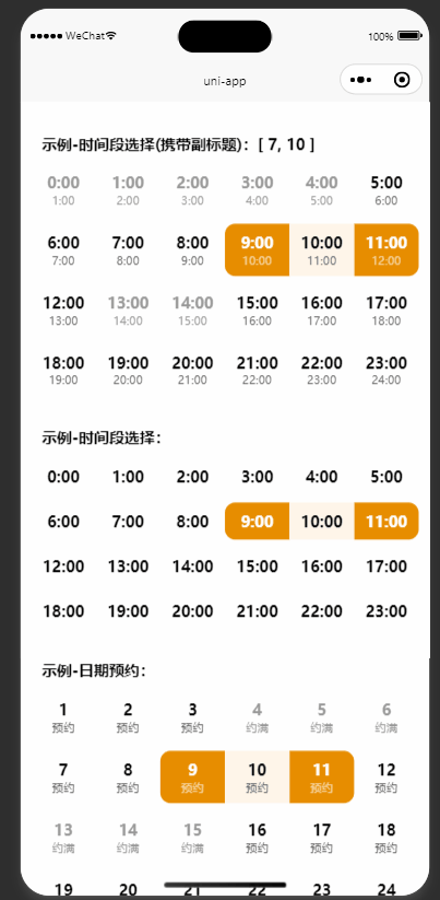 采用uniapp-vue3实现, 是一款支持范围选择的组件,支持H5、微信小程序(其他小程序未测试过,可自行尝试)
