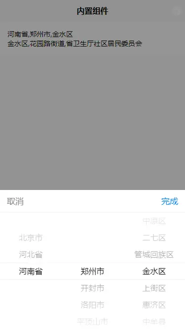 let arr = ['金水区', '410304000000000', 3] 县乡村数据初始化 this.$refs.addrPicker.getAreaData(arr)