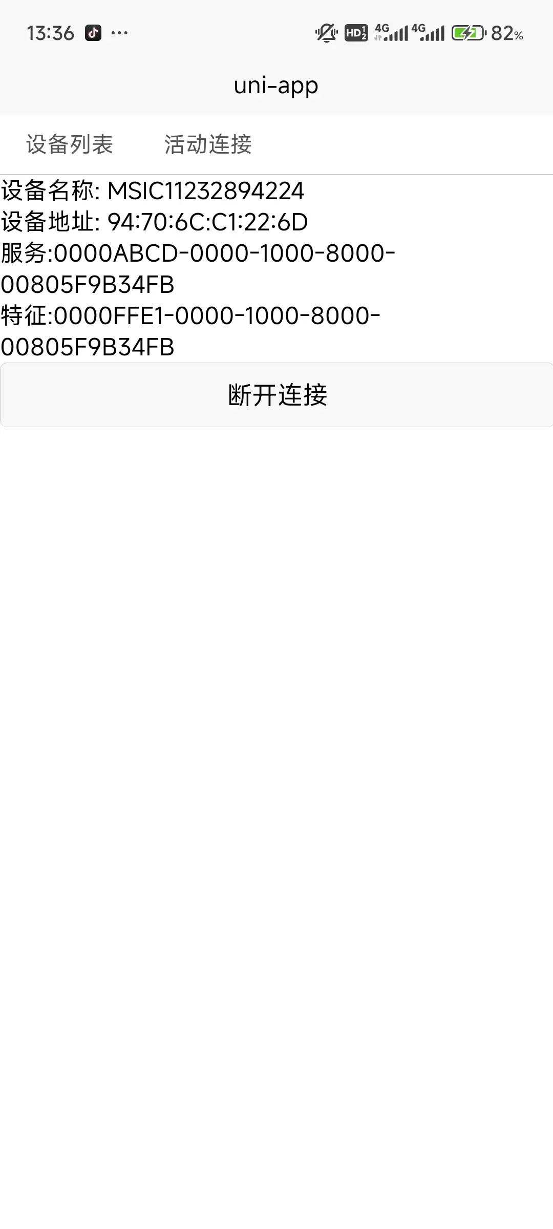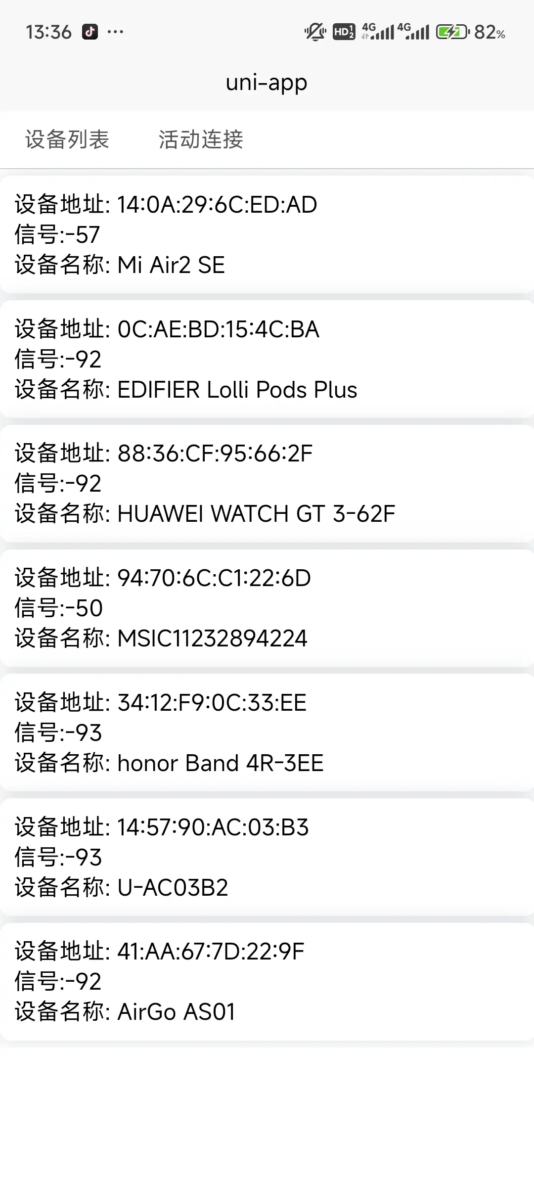 2024-05-28 提供BLE操作的基本接口,并提供一个简单的交互界面。 运行后自动启动设备搜索,搜索结果展示在界面上,点击设备后建立蓝牙连接,展示已连接的设备并提供断开连接的按钮,点击后断开之前的两节,重新搜索设备。