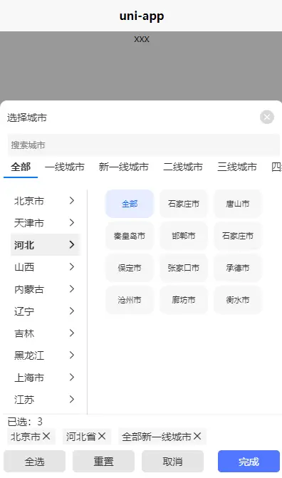 | cityBackType | Number | - | 1返回省id和城市id的数组2返回城市id 3返回省和单选城市 |