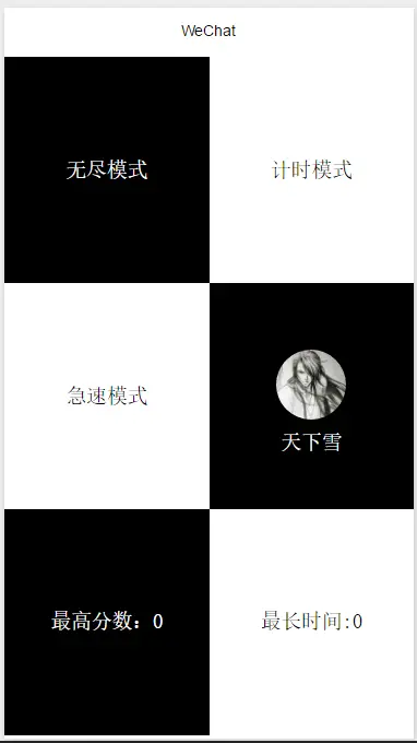 一个简单的小程序 灵感来自当年火热的别踩白块游戏 程序内分成三个模块 无尽模式 计时模式和极速模式 分别对应三种不同玩法 无尽模式和计时模式玩法相似 极速模式多了个自动滑动动画效果