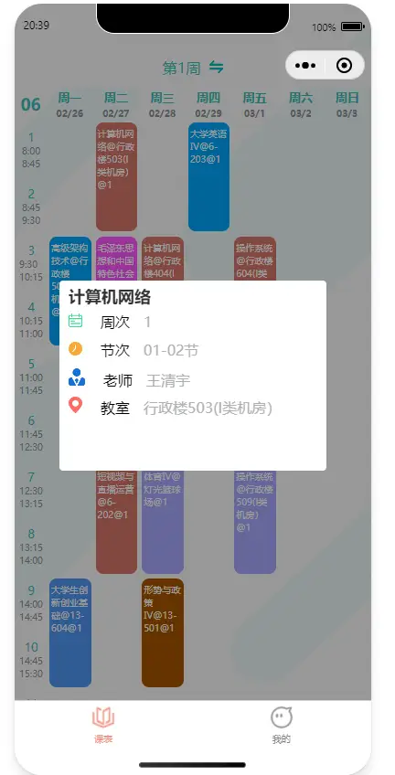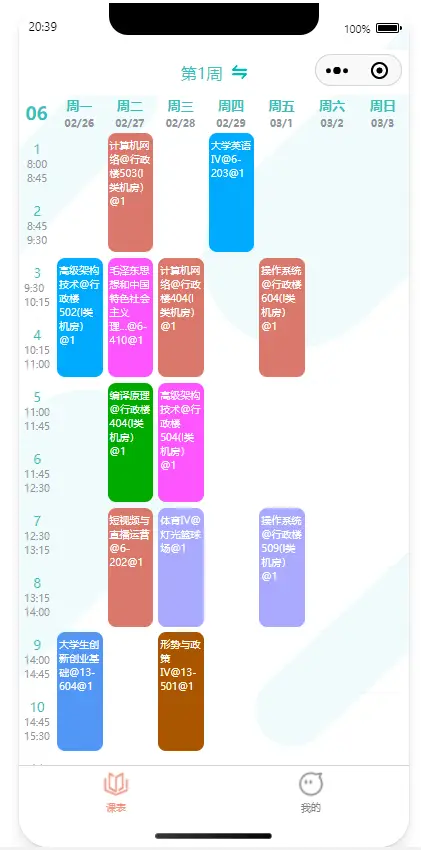 "nowtbale": [ { "name": "面向对象-JAVA实践教学", "teacher": "胡安明", // 老师名称 "room": "行政楼1楼", // 地址 // 周次,该课可以在第二周和第三周出现 "attend": 2, "day": 1, // 星期几,比如在周二星期一 "nums": 2, // 节次-开始 "enum": 4 // 节次-结束 } ]