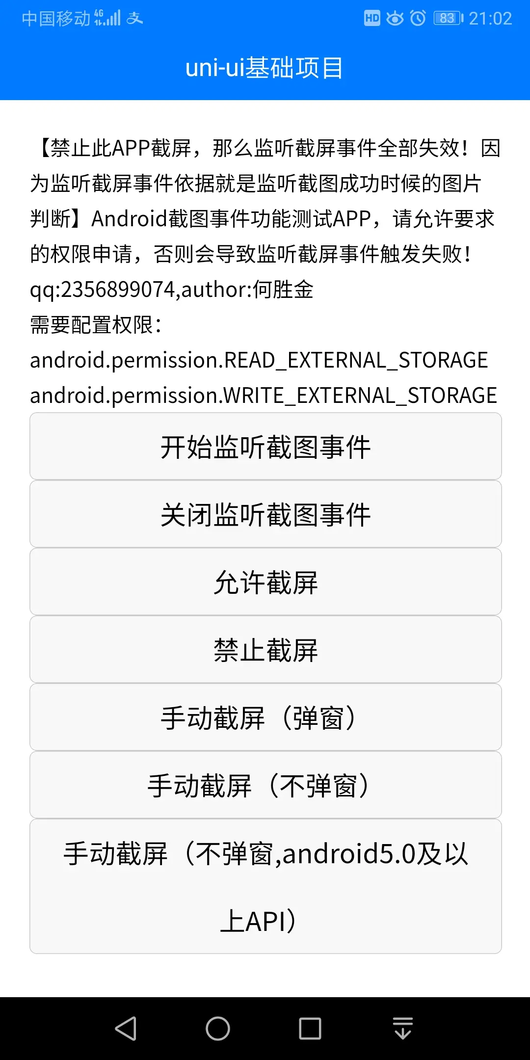 【禁止此APP截屏,那么监听截屏事件全部失效!因为监听截屏事件依据就是监听截图成功时候的图片判断】Android截图事件功能测试APP,请允许要求的权限申请,否则会导致监听截屏事件触发失败!qq:2356899074,author:何胜金