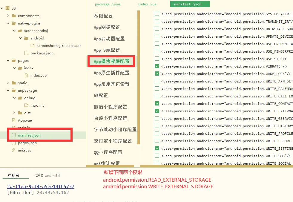 - 在HBuilderX里找到项目,在manifest的app原生插件配置中勾选模块,如需要填写参数则参考插件作者的文档添加。