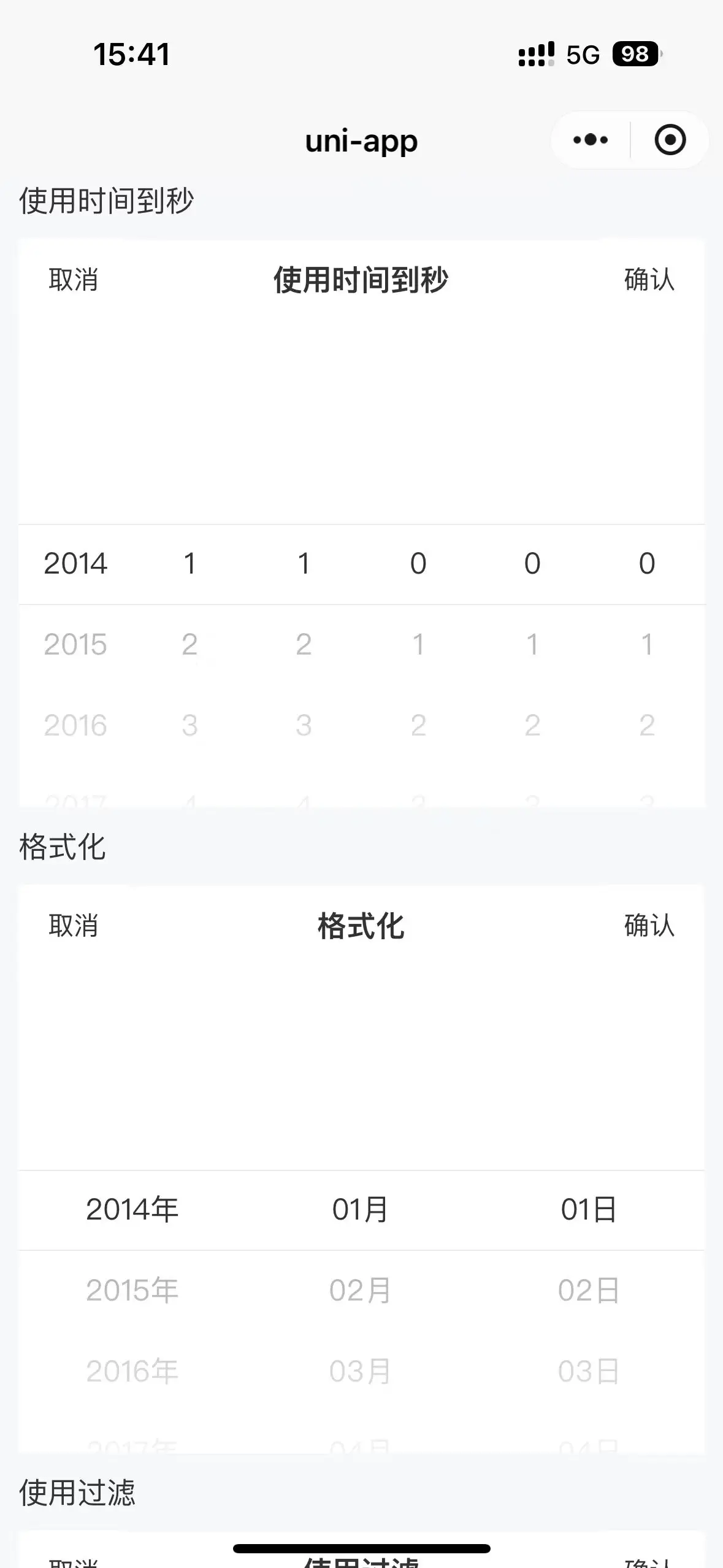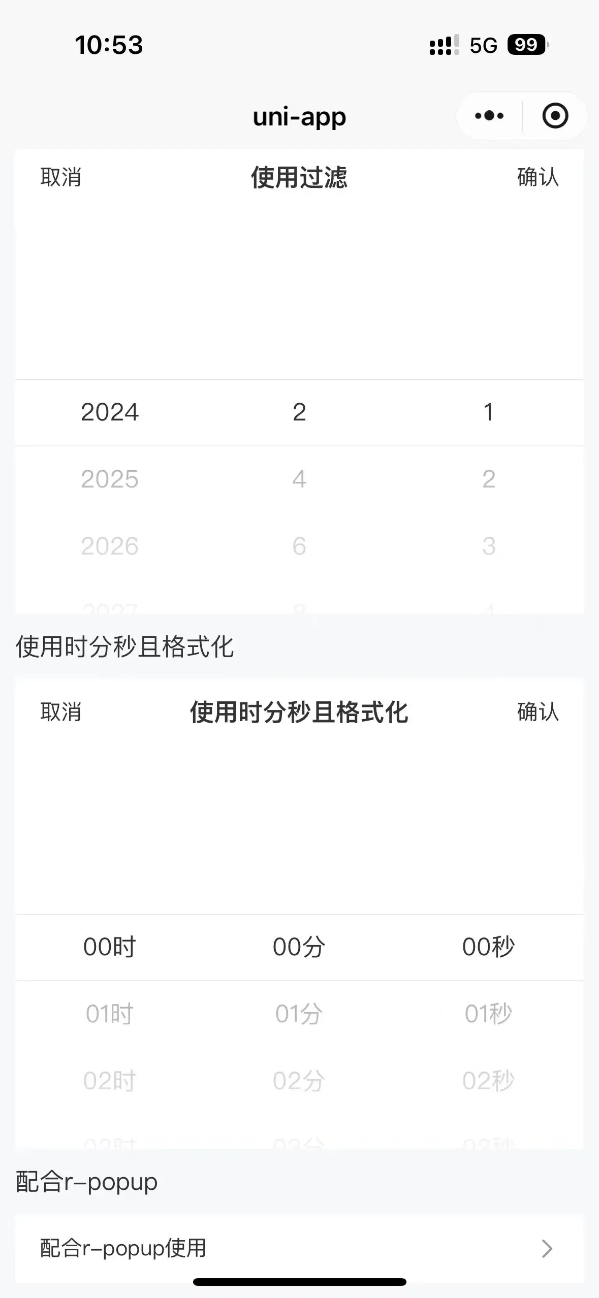 r-date-picker 日期选择器,用于选择年、月、日、时、分、秒,通常与 r-popup 组件配合使用。
