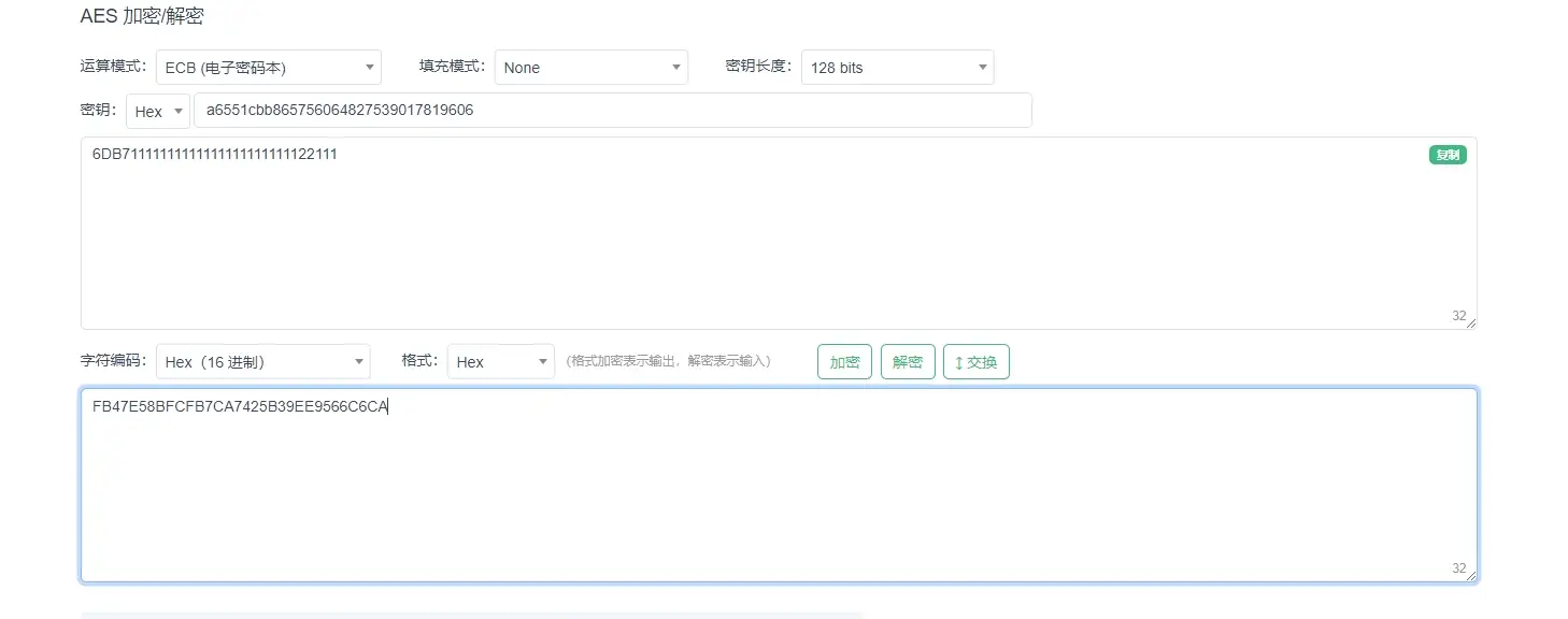运算模式:ECB 填充模式:None 密钥长度:128bit 密钥格式:Hex 字符编码:Hex 16 进制 输出格式:Hex