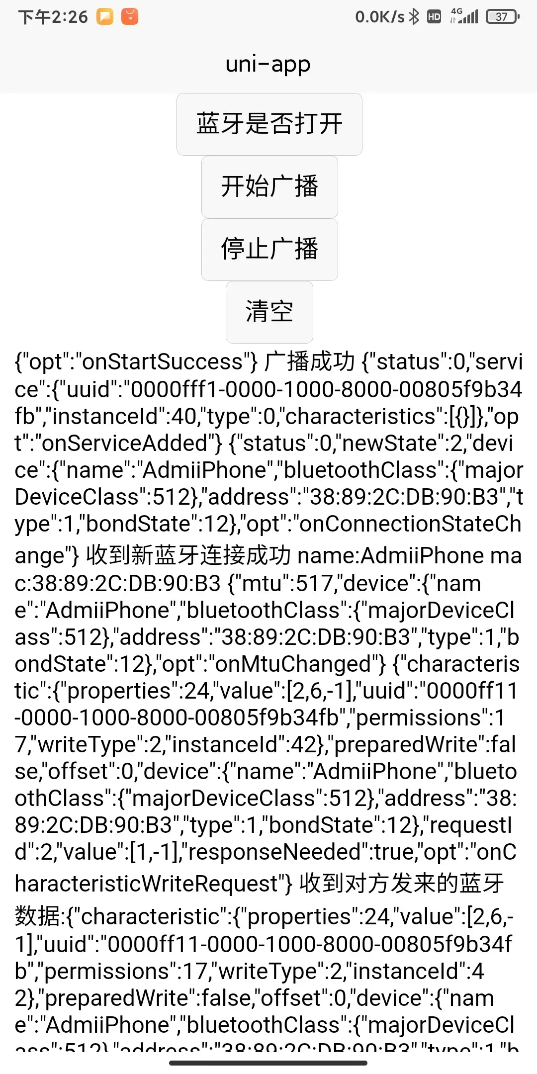 - 广播蓝牙数据,可以广播蓝牙名、serviceUuid、serviceDataUuid、serviceData、发射功率、厂家参数(ID和数据)、广播功率、是否可连接、持续时间