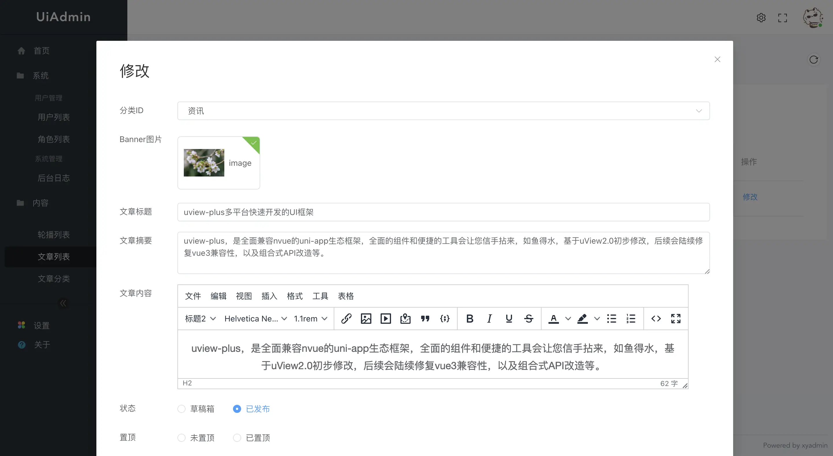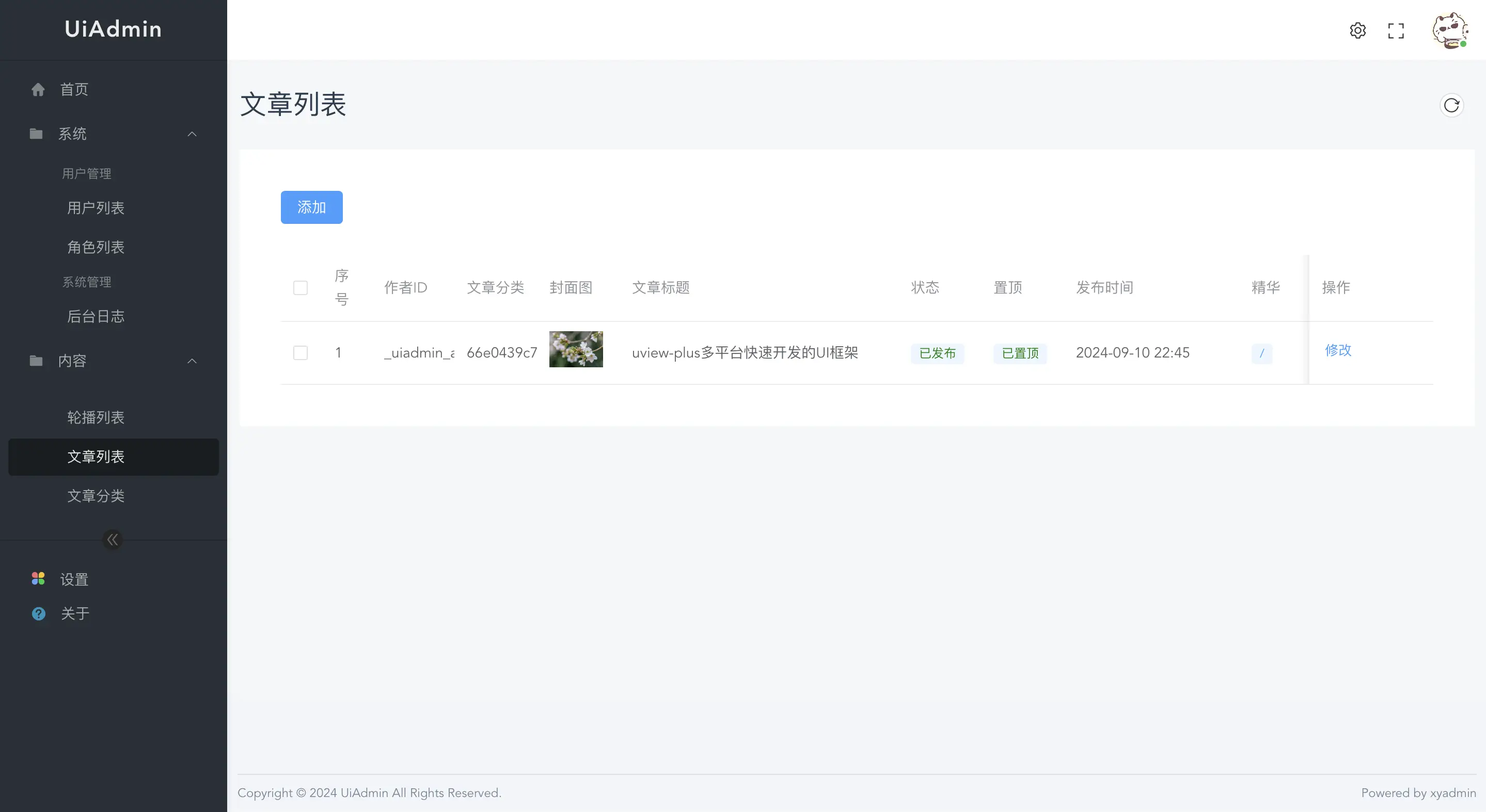 UiAdmin是一套JSON与API驱动的轻量级Vue3+element通用后台。这里是专门针对uniCloud开发的通用后台,旨在大幅度降低管理后台开发的工作量。 除了uniCloud版本,我们还支持传统语言php/java/nodejs/python等各种语言版本的UiAdmin。UiAdmin基于uni-id架构。